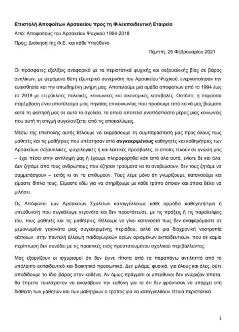 Ομάδα 285 αποφοίτων από το 1994 έως το 2018 του Αρσακείου Ψυχικού αναφέρουν ότι γνωρίζουν και έχουν πληροφορηθεί για σεξουαλικές, ψυχολογικές ή και λεκτικές προσβολές που έχουν υποστεί μαθητές και μαθήτριες από συγκεκριμένους καθηγητές και καθηγήτριες των Αρσακείων. Μάλιστα, κάνουν λόγο για «διαχρονική νοοτροπία κάποιων» και «παντελή έλλειψη παιδαγωγικών ορίων ορισμένων εκπαιδευτικών». Οι απόφοιτοι του Αρσακείου Ψυχικού δηλώνουν ότι στέκονται στο πλευρό όλων των θυμάτων και προτίθενται να τα στηρίξουν με κάθε τρόπο, είτε θέλουν να μιλήσουν είτε όχι. Ταυτόχρονα ζητούν α διερευνηθούν όλα τα γεγονότα, να αναλάβουν οι αρμόδιοι την ευθύνη που τους αναλογεί και να γίνει μια κάθαρση στο σχολείο από πρόσωπα που σχετίζονται με τέτοια περιστατικά.
