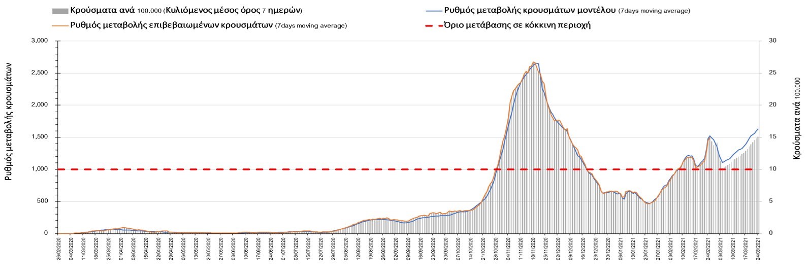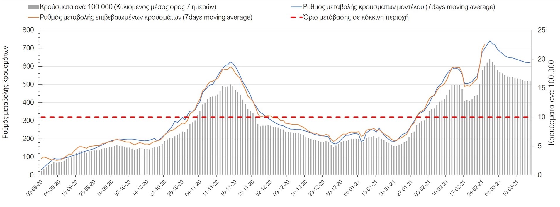 Πορεία του ημερησίου αριθμού των κρουσμάτων (κυλιόμενος μέσος όρος 7 ημερών) στην Ελληνική επικράτεια