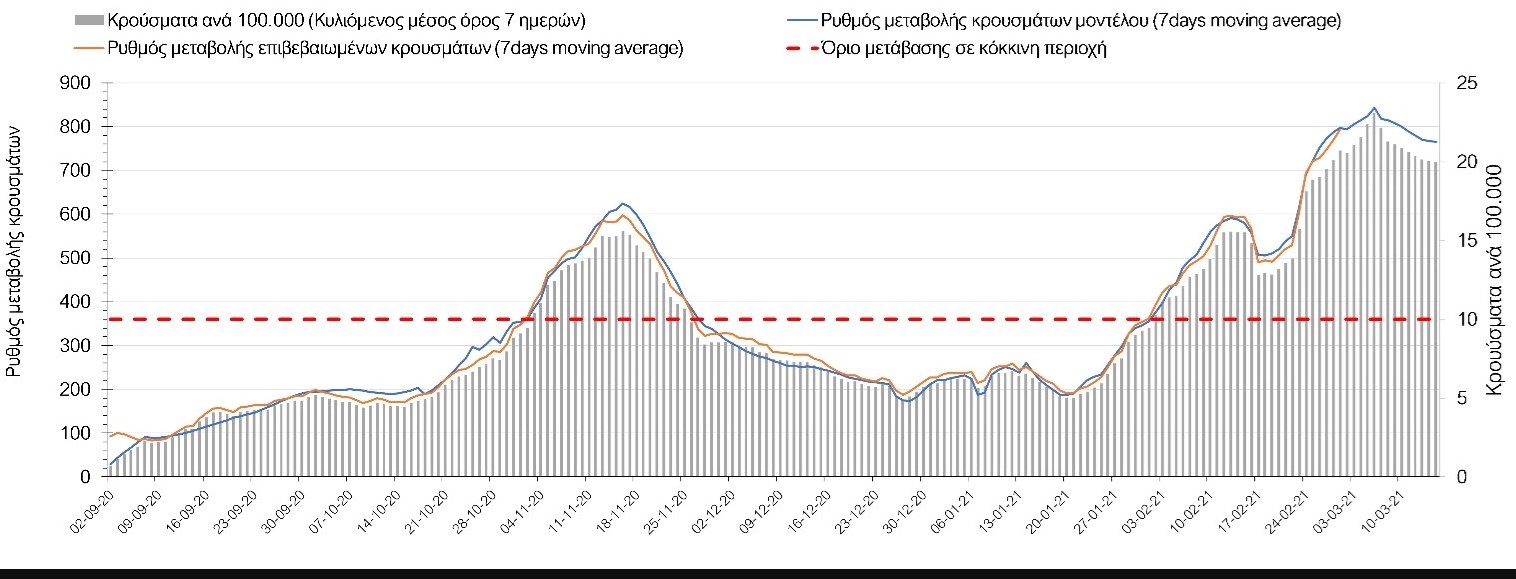 Σύμφωνα με τους ειδικούς, η αύξηση που παρατηρείται πλέον στον αριθμό των ασθενών σε κρίσιμη κατάσταση (διασωληνωμένοι σε ΜΕΘ), καθώς και ο αριθμός των θανάτων συνάδουν με τις προσομοιώσεις του μοντέλου CORE για τον επόμενο μήνα, ενώ και ο αριθμός των νέων κρουσμάτων παραμένει ανησυχητικός. Τα παραπάνω αποτελέσματα αποτυπώνονται και στο δείκτη θετικότητας. Σε πανελλαδικό επίπεδο ο κυλιόμενος εβδομαδιαίος μέσος όρος του δείκτη θετικότητας αυξήθηκε στο 4,3% (η ημερήσια τιμή τη Δευτέρα ήταν 6,6%) ενώ ο κυλιόμενος εβδομαδιαίος μέσος όρος του πραγματικού αριθμού αναπαραγωγής Rt (δηλαδή ο αριθμός των ατόμων που ένας φορέας μπορεί να επιμολύνει) είναι πλέον 1,30 (τιμές του Rt πάνω από τη μονάδα υποδηλώνουν καθαρή αύξηση της διασποράς του ιού στην κοινότητα).
