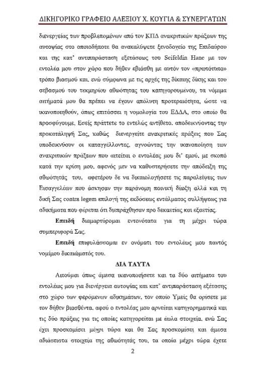 «Παρατηρώ ότι όποιο αίτημα υποβάλλει ο ουσιαστικά μάρτυρας της υποθέσεως, αφού τον εντολέα του, που κατοικεί στη Σουηδία, ουδέποτε εξετάσατε, δικηγόρος Αθηνών Ιωάννης Βλάχος, το ικανοποιείτε αμέσως και με συνοπτικές διαδικασίες, χωρίς καν να κάνετε τον κόπο να συνεννοείστε μαζί μου, ώστε να εκπροσωπήσω σε οιανδήποτε ανακριτική πράξη, που Υμείς κρίνετε ότι πρέπει να διεξαχθεί, τον εντολέα μου», συμπληρώνει ο κ. Κούγιας, ο οποίος στη συνέχεια αναφέρει: «Επειδή διαμαρτύρομαι εντονότατα, διότι, ενώ ο εντολέας μου δι’ εμού και των συνεργατών μου κατέθεσε σ’ Εσάς τα νόμιμα αιτήματα της διενεργείας των προβλεπομένων από τον ΚΠΔ ανακριτικών πράξεων της αυτοψίας στο οποιοδήποτε θα ανακαλύψετε ξενοδοχείο της Επιδαύρου και της κατ’ αντιπαράσταση εξετάσεως του Seifeldin Hane με τον εντολέα μου στον χώρο που δήθεν εβιάσθη με αυτόν τον «πρωτότυπο» τρόπο βιασμού και, ενώ σύμφωνα με τις αρχές της δίκαιης δίκης και του σεβασμού του τεκμηρίου αθωότητας του κατηγορουμένου, τα νόμιμα αιτήματά μου θα πρέπει να έχουν απόλυτη προτεραιότητα, ώστε να ικανοποιηθούν, όπως επιτάσσει η νομολογία του ΕΔΔΑ, στο οποίο θα προσφύγουμε, Εσείς πράττετε το εντελώς αντίθετο, αποδεικνύοντας την προκατάληψή Σας, καθώς διενεργείτε ανακριτικές πράξεις που Σας υποδεικνύουν οι καταγγέλλοντες, αγνοώντας την ικανοποίηση των ανακριτικών πράξεων που αιτείται ο εντολέας μου δι’ εμού, με σκοπό κατά την κρίση μου, αφενός μεν να καθυστερήσετε την απόδειξη της αθωότητάς του, αφετέρου δε να δικαιολογήσετε τις παραλείψεις των Εισαγγελέων που άσκησαν την παράνομη ποινική δίωξη αλλά και τη δική Σας contra legem επιλογή της εκδόσεως εντάλματος συλλήψεως για αδικήματα που φέρεται ότι διεπράχθησαν προ δεκαετίας και εξαετίας. Επειδή διαμαρτύρομαι εντονότατα για τη μέχρι τώρα συμπεριφορά Σας. Επειδή επιφυλάσσομαι εν ονόματι του εντολέως μου παντός νομίμου δικαιώματός του».