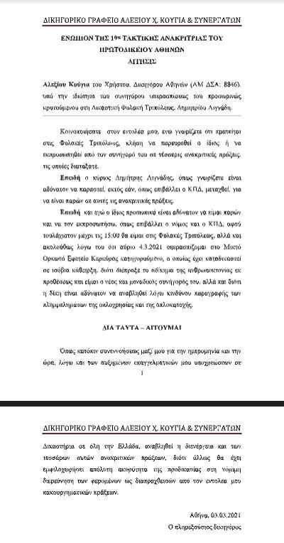 Όσο για το δεύτερο έγγραφο ο κ. Κούγιας ζητεί την αναβολή τεσσάρων ανακριτικών πράξεων που διατάχθηκαν. Συγκεκριμένα, ο συνήγορος του Δημήτρη Λιγνάδη αναφέρει ότι «κοινοποιήσατε στον εντολέα μου, ενώ γνωρίζετε ότι κρατείται στις Φυλακές Τριπόλεως, κλήση να παρευρεθεί ο ίδιος ή να εκπροσωπηθεί από τον συνήγορό του σε τέσσερις ανακριτικές πράξεις, τις οποίες διατάξατε. Επειδή ο κύριος Δημήτρης Λιγνάδης, όπως γνωρίζετε είναι αδύνατον να παραστεί, εκτός εάν, όπως επιβάλλει ο ΚΠΔ, μεταχθεί, για να είναι παρών σε αυτές τις ανακριτικές πράξεις. Επειδή και εγώ ο ίδιος προσωπικά είναι αδύνατον να είμαι παρών και να τον εκπροσωπήσω, όπως επιβάλλει ο νόμος και ο ΚΠΔ, αφού τουλάχιστον μέχρι τις 15:00 θα είμαι στις Φυλακές Τριπόλεως, αλλά και ακολούθως λόγω του ότι αύριο 4.3.2021 υπερασπίζομαι στο Μικτό Ορκωτό Εφετείο Κερκύρας κατηγορούμενο, ο οποίος έχει καταδικαστεί σε ισόβια κάθειρξη, διότι διέπραξε το αδίκημα της ανθρωποκτονίας εκ προθέσεως και είμαι ο νέος και μοναδικός συνήγορός του, αλλά και διότι η δίκη είναι αδύνατον να αναβληθεί λόγω κινδύνου παραγραφής των πλημμελημάτων της οπλοχρησίας και της οπλοκατοχής. Διά-ταύτα αιτούμε όπως κατόπιν συνεννοήσεως μαζί μου για την ημερομηνία και την ώρα, λόγω και των αυξημένων επαγγελματικών μου υποχρεώσεων σε Δικαστήρια σε όλη την Ελλάδα, αναβληθεί η διενέργεια και των τεσσάρων αυτών ανακριτικών πράξεων, διότι άλλως θα έχει εμφιλοχωρήσει απόλυτη ακυρότητα της προδικασίας στη νόμιμη διερεύνηση των φερομένων ως διαπραχθεισών από τον εντολέα μου κακουργηματικών πράξεων».