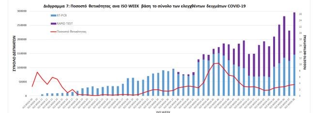 Την εβδομάδα 22 – 28 Φεβρουαρίου (Iso Week 08) το ποσοστό θετικότητας ήταν 3.89% σε σύνολο 146.594 RT-PCR και 149.076 Rapid Ag τεστ που πραγματοποιήθηκαν.