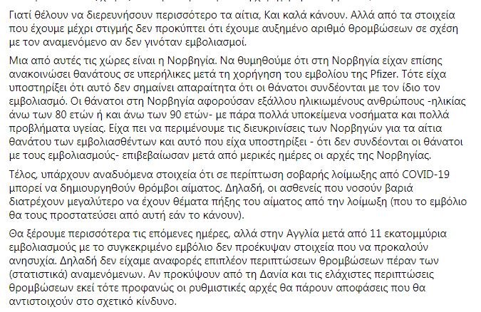 Θα ξέρουμε περισσότερα τις επόμενες ημέρες, αλλά στην Αγγλία μετά από 11 εκατομμύρια εμβολιασμούς με το συγκεκριμένο εμβόλιο δεν προέκυψαν στοιχεία που να προκαλούν ανησυχία. Δηλαδή δεν είχαμε αναφορές επιπλέον περιπτώσεων θρομβώσεων πέραν των (στατιστικά) αναμενόμενων. Αν προκύψουν από τη Δανία και τις ελάχιστες περιπτώσεις θρομβώσεων εκεί τότε προφανώς οι ρυθμιστικές αρχές θα πάρουν αποφάσεις που θα αντιστοιχούν στο σχετικό κίνδυνο.