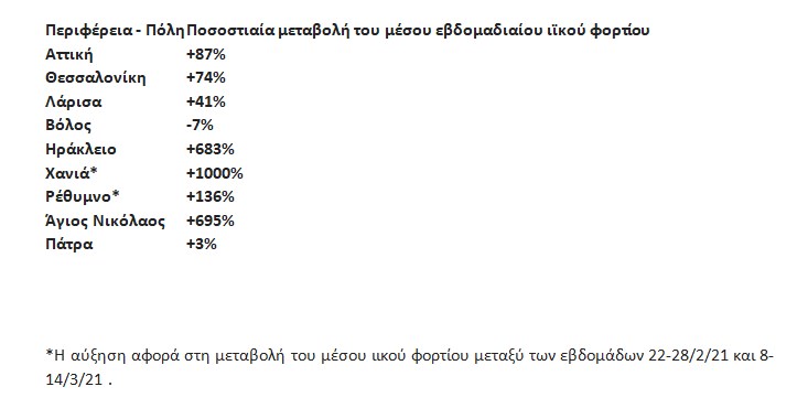 Σήμερα δόθηκαν στη δημοσιότητα τα αποτελέσματα των εργαστηριακών ελέγχων του Εθνικού Δικτύου Επιδημιολογίας Λυμάτων για την επιδημιολογική επιτήρηση του κορονοϊού στα αστικά λύματα που αφορούν την περίοδο από 8 έως 14 Μαρτίου 2021. Τα δείγματα προέρχονται από την Περιφέρεια Αττικής και τις πόλεις της Θεσσαλονίκης, της Λάρισας, του Βόλου, του Ηρακλείου, των Χανίων, του Ρεθύμνου, του Αγίου Νικολάου και της Πάτρας. Τα δείγματα λαμβάνονται από τις εισόδους των εκάστοτε Μονάδων Επεξεργασίας Λυμάτων και αντιστοιχούν στον πληθυσμό που εξυπηρετείται από αυτές. Οι μεγαλύτερες αυξήσεις παρατηρούνται στην Κρήτη: Ηράκλειο με 683%, Χανιά με 1000%, Ρέθυμνο με 136% και Άγιος Νικόλαος με 695%.