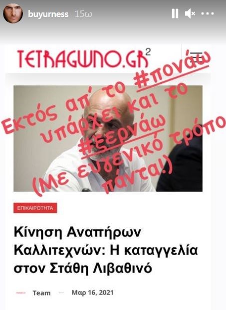«Εκτός από το πονάω, υπάρχει και το ξερνάω… (Με ευγενικό τρόπο πάντα)», έγραψε ο γνωστός ηθοποιός στον προσωπικό του λογαριασμό στο Instagram.