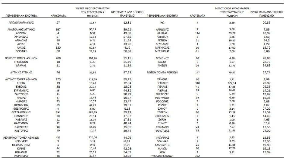 Διψήφιο αριθμό κρουσμάτων επίσης κατέγραψαν οι: Αιτωλοακαρνανία, Αργολίδα, Αρκαδία, Βοιωτία, Γρεβενά, Δράμα, Έβρος, Εύβοια, Ζάκυνθος, Ηλεία, Ημαθία, Ηράκλειο, Ιωάννινα, Καβάλα, Κάλυμνος, Καρδίτσα, Καστοριά, Κιλκίς, Κοζάνη, Κορινθία, Λέσβος, Μαγνησία, Μεσσηνία, Μύκονος, Ξάνθη, Πέλλα, Πιερία, Ρέθυμνο, Σέρρες, Τρίκαλα, Φθιώτιδα, Χαλκιδική και Χανιά.