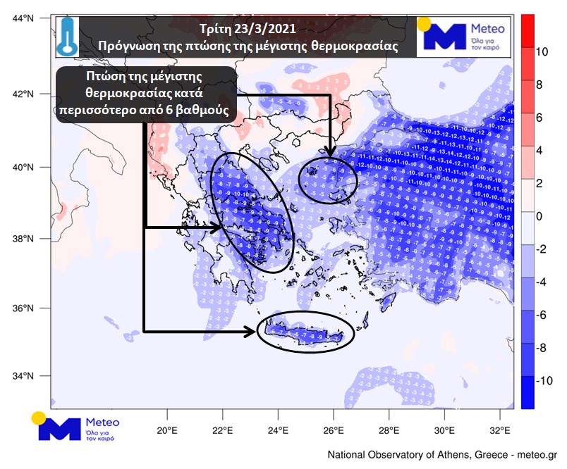 Η θερμοκρασία θα παρουσιάσει σημαντική πτώση στα ανατολικά ηπειρωτικά, στο Αιγαίο και στην Κρήτη, κυρίως ως προς τις μέγιστες τιμές της, οι οποίες κατά τόπους αναμένεται να είναι κατά 6 έως 10 βαθμούς χαμηλότερες από αυτές της Δευτέρας 22/03.