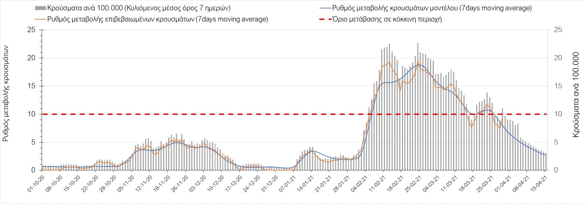 Σχήμα 49. Πορεία του ημερησίου αριθμού των κρουσμάτων (κυλιόμενος μέσος όρος 7 ημερών) στην Θάσο Συμπεράσματα:Η αύξηση που παρατηρείται πλέον στον αριθμό των ασθενών σε κρίσιμη κατάσταση (διασωληνωμένοι σε ΜΕΘ), καθώς και ο αριθμός των θανάτων (αν και με κάποια μικρή απόκλιση τη Δευτέρα) συνάδουν με τις προσομοιώσεις του μοντέλου CORE, όπως και ο αριθμός των κρουσμάτων, μετά και τις επικαιροποιημένες προβλέψεις προ 15 ημερών, όπου ελήφθη υπόψιν η μεγαλύτερη διασπορά των μεταλλαγμένων και ταχύτερα μεταδιδόμενων στελεχών. Σε πανελλαδικό επίπεδο ο κυλιόμενος εβδομαδιαίος μέσος όρος του δείκτη θετικότητας διαμορφώθηκε στο 7,4% (η ημερήσια τιμή τη Δευτέρα είναι 11,0%) ενώ ο κυλιόμενος εβδομαδιαίος μέσος όρος του πραγματικού αριθμού αναπαραγωγής Rt (δηλαδή ο αριθμός των ατόμων που ένας φορέας μπορεί να επιμολύνει) διαμορφώθηκε στο 1,02 (τιμές του Rt πάνω από τη μονάδα υποδηλώνουν καθαρή αύξηση της διασποράς του ιού στην κοινότητα). Πλέον, με τον υψηλότερο αριθμό φορέων του μεταλλαγμένου στελέχους και την αναθεώρηση στις προβλέψεις, παρατηρούμε μια αμυδρά τάση κάμψης του ρυθμού αύξησης καθημερινά, και μπορεί να χρειαστεί να παραταθούν τα περιοριστικά μέτρα τουλάχιστον σε ό,τι αφορά στο άνοιγμα του λιανικού εμπορίου και μετά το τέλος Μαρτίου. Παρά την εφαρμογή οριζόντιων μέτρων ανάσχεσης της πανδημίας που εφαρμόσθηκαν από τα τέλη Οκτωβρίου, η πορεία της τελευταίας διαφοροποιείται από περιοχή σε περιοχή. Οι παραπάνω παρατηρήσεις τείνουν στο συμπέρασμα ότι η διαχείριση του υγειονομικού κινδύνου θα πρέπει να εξεταστεί σε τοπικό επίπεδο. Πλέον προβληματίζουν πέρα από την Αττική και τη Θεσσαλονίκη, η Αχαΐα, η Αιτωλοακαρνανία, η Εύβοια, η Βοιωτία, η Χαλκιδική, καθώς επίσης η Αρκαδία, η Ηλεία, η Αργολίδα, η Κορινιθία, η Φθιώτιδα, η Ευρυτανία, η Λάρισα, η Κοζάνη, η Καστοριά, η Καβάλα, η Χίος, το Ηράκλειο, τα Χανιά, τα Ιωάννινα, η Ημαθία, η Πέλλα, το Κιλκίς, τα Γρεβενά, η Μαγνησία και η Καρδίτσα. Ανάγκη αυξημένης επιτήρησης έχουν και τα Τρίκαλα, η Θεσπρωτία (η οποία όμως περιμένουμε να βγει από τις κόκκινες περιοχές μέχρι το τέλος του μήνα), και οι Σέρρες, Συνολικά, τα τεστ ανίχνευσης θα πρέπει να φτάσουν τουλάχιστον στα 120.000 και να δίνεται έμφαση στοχευμένα στις περιφερειακές ενότητες στις οποίες η δυναμική της διασποράς φαίνεται να είναι ανησυχητική για 1-2 ημέρες ώστε να ανιχνεύονται οι ασυμπτωματικοί και προσυμπτωματικοί φορείς και να σπάει η αλυσίδα μετάδοσης βάζοντάς τους σε καραντίνα. Λόγω της ανησυχίας που εγείρει η παρουσία στην κοινότητα των μεταλλαγμένων στελέχους του SARS-CoV-2 (κυρίως η βρετανική και η νοτιοαφρικανική μετάλλαξη) και προκειμένου να περιορίσουμε ή τουλάχιστον να καθυστερήσουμε την ευρεία διασπορά τους, προτείνουμε τα ακόλουθα μέτρα πριν συζητηθεί το περαιτέρω άνοιγμα εκπαιδευτικών και οικονομικών δραστηριοτήτων:– πιστή εφαρμογή του ήδη υπάρχοντος νομοθετικού πλαισίου για την τηλεργασία (όσο το δυνατόν περισσότερο, αλλά τουλάχιστον 50%) ή ακόμη και αύξηση του ελάχιστου ορίου τηλεργασίας στο 75% όπου αυτό είναι δυνατόν τόσο από δημόσιους όσο και ιδιωτικούς φορείς – είναι απαραίτητο να υπάρξει άμεσα πολύ μεγαλύτερος έλεγχος της εφαρμογής της σχετικής ΚΥΑ από όλους τους εργοδότες του ιδιωτικού και δημόσιου τομέα. Σημερινά στοιχεία δείχνουν ότι το επίπεδο τηλεργασίας στον ιδιωτικό τομέα ανέρχεται οριακά στο 25%. Υπάρχει άμεση ανάγκη για 