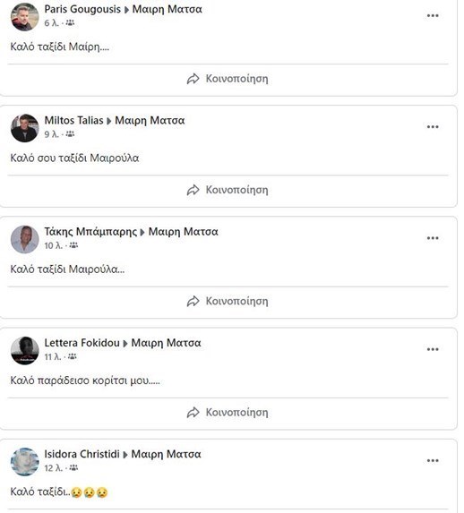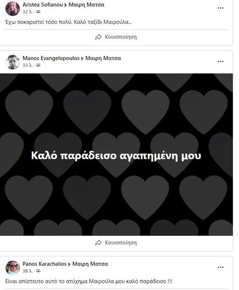 Δεκάδες συγκινητικά μηνύματα έγραψαν οι συνεργάτες της Μαίρης Μάτσα, στη σελίδα της στο Facebook, αποχαιρετώντας την αγαπημένη τους φίλη και συνάδελφο.