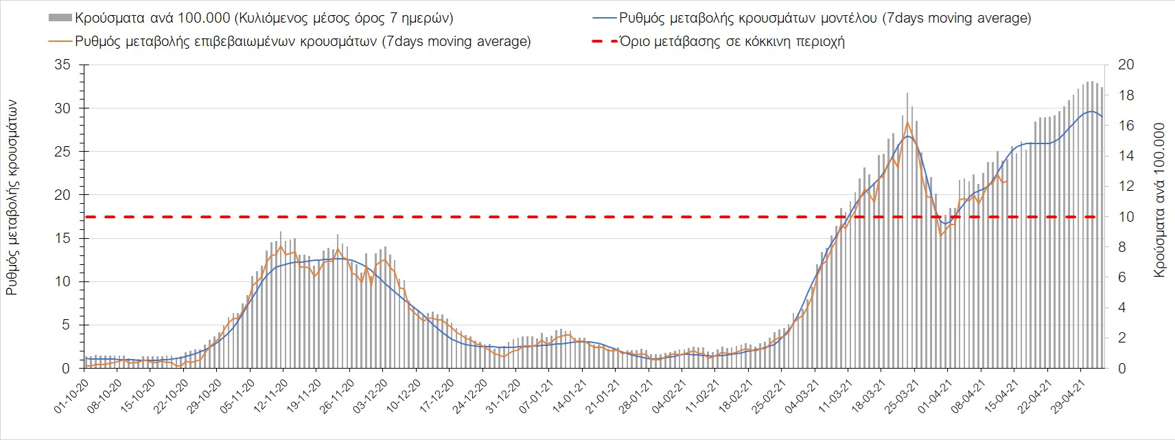 Σχήμα 49. Πορεία του ημερησίου αριθμού των κρουσμάτων (κυλιόμενος μέσος όρος 7 ημερών) στην ΘάσοΣυμπεράσματα:Η αύξηση που παρατηρείται πλέον στον αριθμό των ασθενών σε κρίσιμη κατάσταση (διασωληνομένοι σε ΜΕΘ), καθώς και ο αριθμός των θανάτων (αν και με κάποια μικρή απόκλιση σήμερα) συνάδουν με τις προσομοιώσεις του μοντέλου CORE, όπως και ο αριθμός των κρουσμάτων, μετά και τις επικαιροποιημένες προβλέψεις προ 15 ημερών, όπου ελήφθη υπόψιν η μεγαλύτερη διασπορά των μεταλλαγμένων και ταχύτερα μεταδιδόμενων στελεχών. Σε πανελλαδικό επίπεδο ο κυλιόμενος εβδομαδιαίος μέσος όρος του δείκτη θετικότητας διαμορφώθηκε στο 6,1% (η ημερήσια τιμή είναι 5,3%) ενώ ο κυλιόμενος εβδομαδιαίος μέσος όρος του πραγματικού αριθμού αναπαραγωγής Rt (δηλαδή ο αριθμός των ατόμων που ένας φορέας μπορεί να επιμολύνει) διαμορφώθηκε στο 0,96 (τιμές του Rt κάτω από τη μονάδα υποδηλώνουν καθαρή μείωση της διασποράς του ιού στην κοινότητα). Η ταυτόχρονη μείωση και των δύο δεικτών, που παρατηρήθηκε και τις προηγούμενες ημέρες, υποδηλώνει κάμψη της ανοδικής τάσης στο σύνολο της χώρας (και κυρίως στην Αθήνα, ενώ αναμένεται να ακολουθήσει και η Θεσσαλονίκη). Όμως, με δεδομένο το άνοιγμα του λιανικού εμπορίου στις 5 Απριλίου (εκτός άπο τις περιοχές της Θεσσαλονίκης, Αχαΐας που θα πραγματοποιηθεί στις 12 Απριλίου και Κοζάνης που ακόμα παραμένει κλειστό) και των Λυκείων στις 12 Απριλίου, είναι ακομα πιο σημαντική η τήρηση των μέτρων, ενώ ύψιστης σημασίας στις επόμενες εβδομάδες θα αποδειχθεί η ορθή και μαζική εφαρμογή των self test, με ταυτόχρονη αύξηση της ιχνηλασίας των επαφών των ανιχνευθέντων ως θετικοί και καραντίνα 14 ημερών για τους συμπολίτες μας που θα επιβεβαιωθεί ότι είναι θετικοί στην μόλυνση με SARS-CoV-2 ακόμη και αν είναι ασυμπτωματικοί. Παρά την εφαρμογή οριζόντιων μέτρων ανάσχεσης της πανδημίας που εφαρμόσθηκαν από τα τέλη Οκτωβρίου, η πορεία της τελευταίας διαφοροποιείται από περιοχή σε περιοχή. Οι παραπάνω παρατηρήσεις τείνουν στο συμπέρασμα ότι η διαχείριση του υγειονομικού κινδύνου θα πρέπει να συνεχίσει να εξετάζεται σε τοπικό επίπεδο. Πλέον προβληματίζουν πέρα από την Αττική και τη Θεσσαλονίκη, η Αχαΐα, η Αιτωλοακαρνανία, η Εύβοια, η Βοιωτία, η Χαλκιδική, καθώς επίσης η Αρκαδία, η Ηλεία, η Αργολίδα, η Κορινιθία, η Φθιώτιδα, η Ευρυτανία, η Λάρισα, η Κοζάνη, η Καστοριά, η Καβάλα, η Χίος, το Ηράκλειο, τα Χανιά, τα Ιωάννινα, η Ημαθία, η Πέλλα, το Κιλκίς, τα Γρεβενά, η Μαγνησία, η Καρδίτσα και πλέον και το Λασίθι. Ανάγκη αυξημένης επιτήρησης έχουν το Κιλκίς, οι Σέρρες και η Πέλλα. Συνολικά, τα τεστ ανίχνευσης θα πρέπει να φτάσουν τουλάχιστον στα 120.000 και να δίνεται έμφαση στοχευμένα στις περιφερειακές ενότητες στις οποίες η δυναμική της διασποράς φαίνεται να είναι ανησυχητική για 1-2 ημέρες ώστε να ανιχνεύονται οι ασυμπτωματικοί και προσυμπτωματικοί φορείς και να σπάει η αλυσίδα μετάδοσης βάζοντάς τους σε καραντίνα. Λόγω της ανησυχίας που εγείρει η παρουσία στην κοινότητα των μεταλλαγμένων στελέχους του SARS-CoV-2 (κυρίως η βρετανική και η νοτιοαφρικανική μετάλλαξη) και προκειμένου να περιορίσουμε ή τουλάχιστον να καθυστερήσουμε την ευρεία διασπορά τους, προτείνουμε τα ακόλουθα μέτρα πριν συζητηθεί το περαιτέρω άνοιγμα εκπαιδευτικών και οικονομικών δραστηριοτήτων:– πιστή εφαρμογή του ήδη υπάρχοντος νομοθετικού πλαισίου για την τηλεργασία (όσο το δυνατόν περισσότερο, αλλά τουλ
