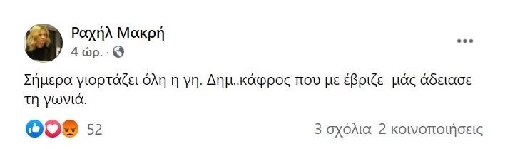 Λίγες ώρες μετά τον αιφνίδιο θανάτου του γνωστού δημοσιογράφου, ο οποίος έχασε τη ζωή του κατά τη διάρκεια επαγγελματικού ραντεβού, η Ραχήλ Μακρή έγραψε στο facebook: “Σήμερα γιορτάζει όλη η γη. Δημ..κάφρος που με έβριζε μάς άδειασε τη γωνιά”. Η ανάρτησή της προκάλεσε θύελλα αντιδράσεων από χρήστες στα social media.
