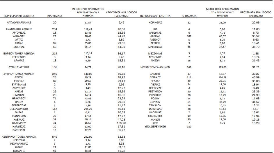 Έτσι από τα 3.781 νέα εγχώρια κρούσματα, τα 1.799 εντοπίστηκαν στο Λεκανοπέδιο, 512 νέες μολύνσεις καταγράφηκαν στη Θεσσαλονίκη, ενώ τριψήφιος είναι ο αριθμός στη Λάρισα με 101 νέα κρούσματα. Προβληματική παραμένει η κατάσταση στην Αχαΐα με 92 νέα κρούσματα, στην Εύβοια με 62, στο Ηράκλειο με 71, στην Καβάλα με 59, στην Κοζάνη με 62, στη Μαγνησία με 68, στην Πέλλα με 49 και στις Σέρρες με 61.