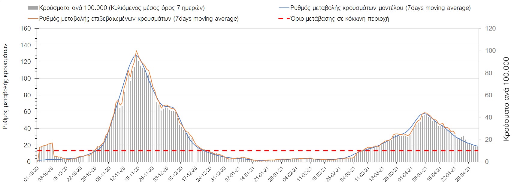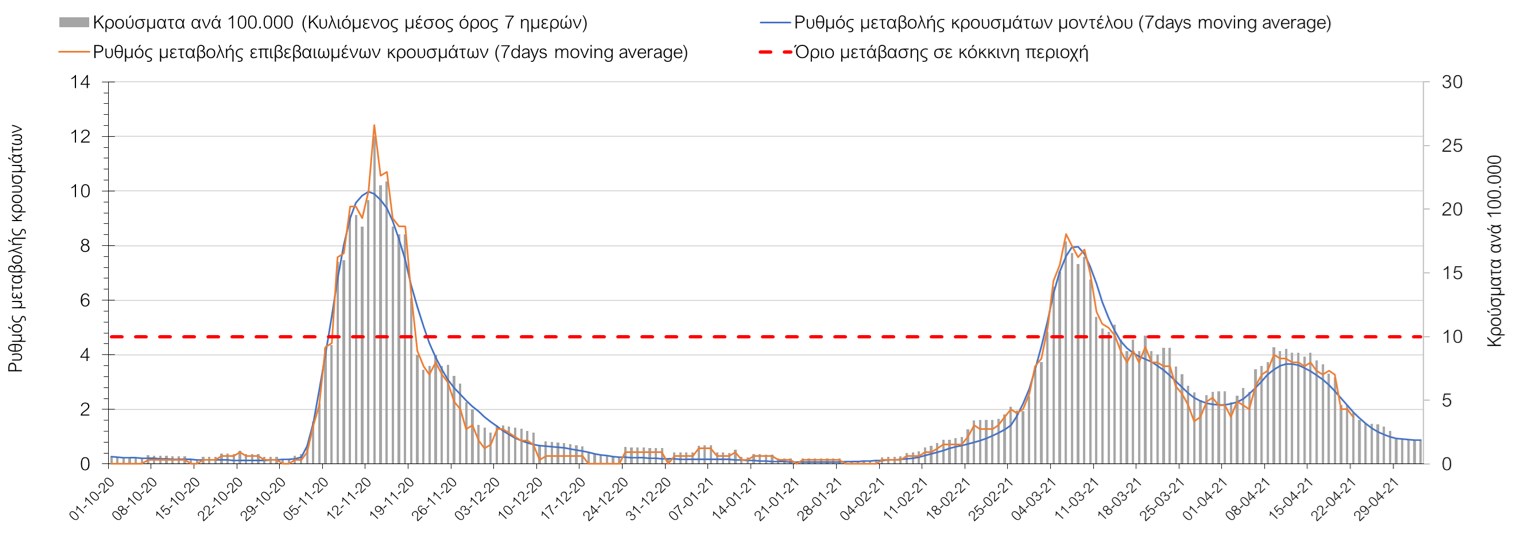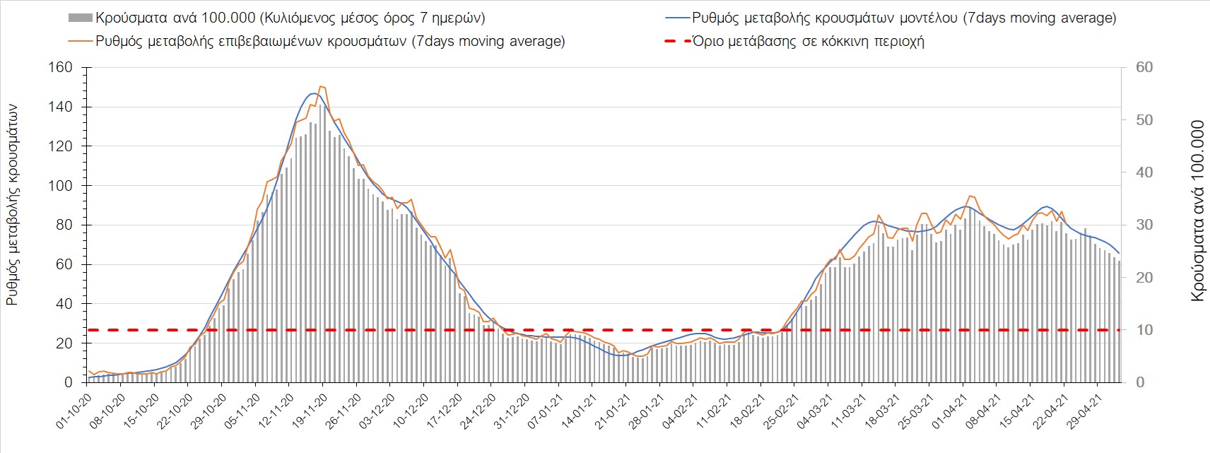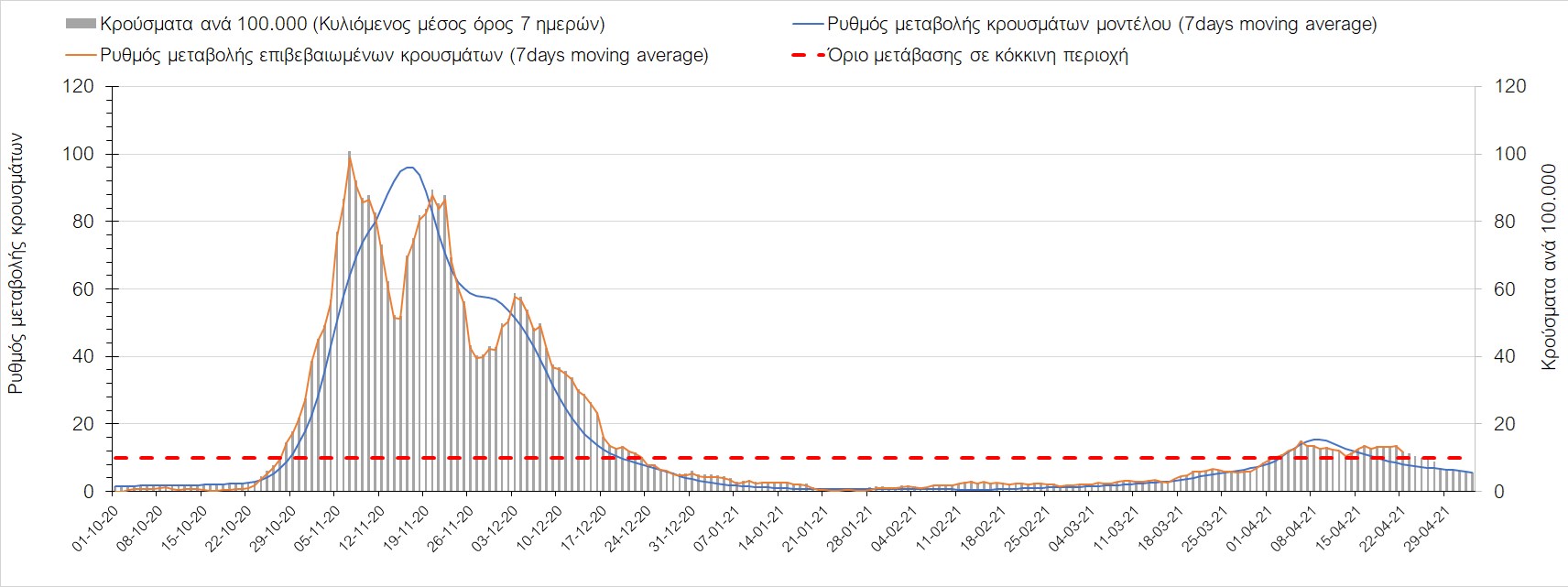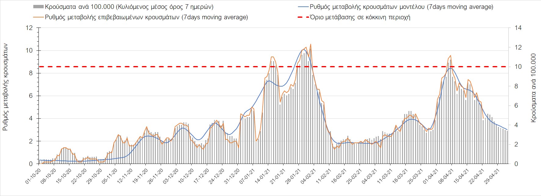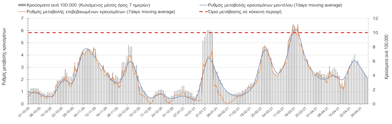 Σχήμα 52. Πορεία του ημερησίου αριθμού των κρουσμάτων (κυλιόμενος μέσος όρος 7 ημερών) στην ΘάσοΣυμπεράσματα:Με τα αποτελέσματα, της Πέμπτης διαφαίνεται κάμψη στον αριθμό των ασθενών σε κρίσιμη κατάσταση (διασωληνομένοι σε ΜΕΘ), η οποία θα εκφραστεί σύντομα και στον αριθμό των θανάτων. Οι προβλέψεις αυτές συνάδουν με τις προσομοιώσεις του μοντέλου CORE, όπως και ο αριθμός των κρουσμάτων, μετά και τις επικαιροποιημένες προβλέψεις προ 40 ημερών, όπου ελήφθη υπόψιν η μεγαλύτερη διασπορά των μεταλλαγμένων και ταχύτερα μεταδιδόμενων στελεχών. Σε πανελλαδικό επίπεδο ο κυλιόμενος εβδομαδιαίος μέσος όρος του δείκτη θετικότητας διαμορφώθηκε στο 5,4% (η ημερήσια τιμή είναι 4,4%) ενώ ο κυλιόμενος εβδομαδιαίος μέσος όρος του πραγματικού αριθμού αναπαραγωγής Rt (δηλαδή ο αριθμός των ατόμων που ένας φορέας μπορεί να επιμολύνει) διαμορφώθηκε στο 0,95 (τιμές του Rt κάτω από τη μονάδα υποδηλώνουν καθαρή μείωση της διασποράς του ιού στην κοινότητα). Η ταυτόχρονη μείωση και των δύο δεικτών, που παρατηρήθηκε τις προηγούμενες ημέρες και συνεχίζεται και αυτή την εβδομάδα, υποδηλώνει την κάμψη της ανοδικής τάσης στο σύνολο της χώρας (και κυρίως στην Αθήνα, ενώ αναμένεται να ακολουθήσει και η Θεσσαλονίκη). Η ήπια αναχαίτιση του 3ου κύματος που παρατηρείται, οφείλεται σε ένα συνδυασμό παραμέτρων, οι οποίες είναι η συνέχιση του lockdown, η χρήση των self-test, η αύξηση του αριθμού των τεστ από τον ΕΟΔΥ, γεγονός που συντελεί στην απομάκρυνση από τις αλυσίδες μετάδοσης τωνασυμπτωματικών και προσυμπτωματικών φορέων, η προοδευτική βελτίωση του καιρού και σε μικρότερο βαθμό η πρόοδος των εμβολιασμών, η σημασία των οποίων στον έλεγχο της πανδημίας θα αρχίσει να είναι πιο εμφανής από το τέλος του επόμενου μήνα. Όμως, με δεδομένο το άνοιγμα του λιανικού εμπορίου και των Λυκείων, είναι ακόμα πιο σημαντική η τήρηση των μέτρων, ενώ ύψιστης σημασίας στις επόμενες εβδομάδες θα αποδειχθεί η ορθή και μαζική εφαρμογή των self-test, με ταυτόχρονη αύξηση της ιχνηλασίας των επαφών των ανιχνευθέντων ως θετικοί και καραντίνα 14 ημερών για τους συμπολίτες μας που θα επιβεβαιωθεί ότι είναι θετικοί στην μόλυνση με SARS-CoV-2 ακόμη και αν είναι ασυμπτωματικοί. Δεδομένου ότι τελικά ο αριθμός των self-test που πραγματοποιούνται ημερησίως δεν έχει φθάσει στα επιθυμητά νούμερα στα οποία βασίζονται οι προβολές που παρουσιάζονται στην παρούσα τεχνική έκθεση μέχρι το Πάσχα, μόλις έχουμε νεώτερα για τον ακριβή αριθμό τους και τη συχνότητα εκτέλεσης αυτών, θα επαναεπικαιροποιήσουμε τις προβλέψεις μας. Αξίζει επίσης να σημειωθεί ότι στην Αθήνα τις τελευταίες ημέρες παρατηρήθηκαν συρροές, οι πιθανές επιπτώσεις των οποίων θα αποτυπωθούν στις επόμενες ημέρες. Τέλος, πολύ ισχυρές επιφυλάξεις έχουμε για το σχετικά πρόωρο άνοιγμα της εστίασης που αποφασίστηκε σήμερα για τις 3 Μαΐου, και που θα μπορούσε να συντελέσει σε προσωρινή αναστροφή της διαφαινόμενης σταθεροποιητικής/πτωτικής πορείας προς το τέλος του Μαΐου. Επιπλέον πρέπει να γίνει εντελώς καθαρό ότι το πρόωρο άνοιγμα της εστίασης θα συντελέσει σε αύξηση των επαφών (και άρα της μεταδοτικότητας), και όχι σε αποσυμπίεση των εικόνων συνωστισμού που παρατηρούμε τις τελευταίες ημέρες κυρίως σε περιοχές της Αθήνας, δεδομένου ότι η εστίαση θα δώσει την ευκαιρία αύξησης των επαφών σε ηλικιακές ομάδες που τώρα βρίσκονται εκτός των ηλικιών που συγχρωτίζονται.Παρά την 