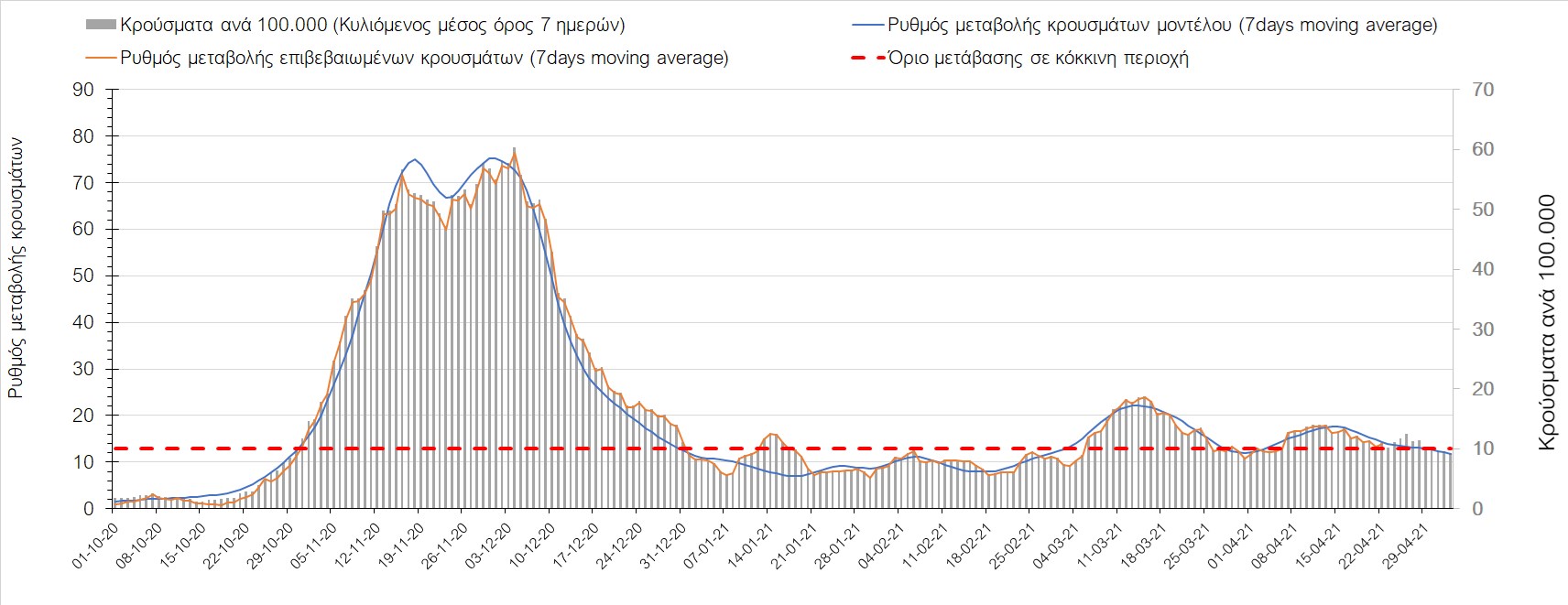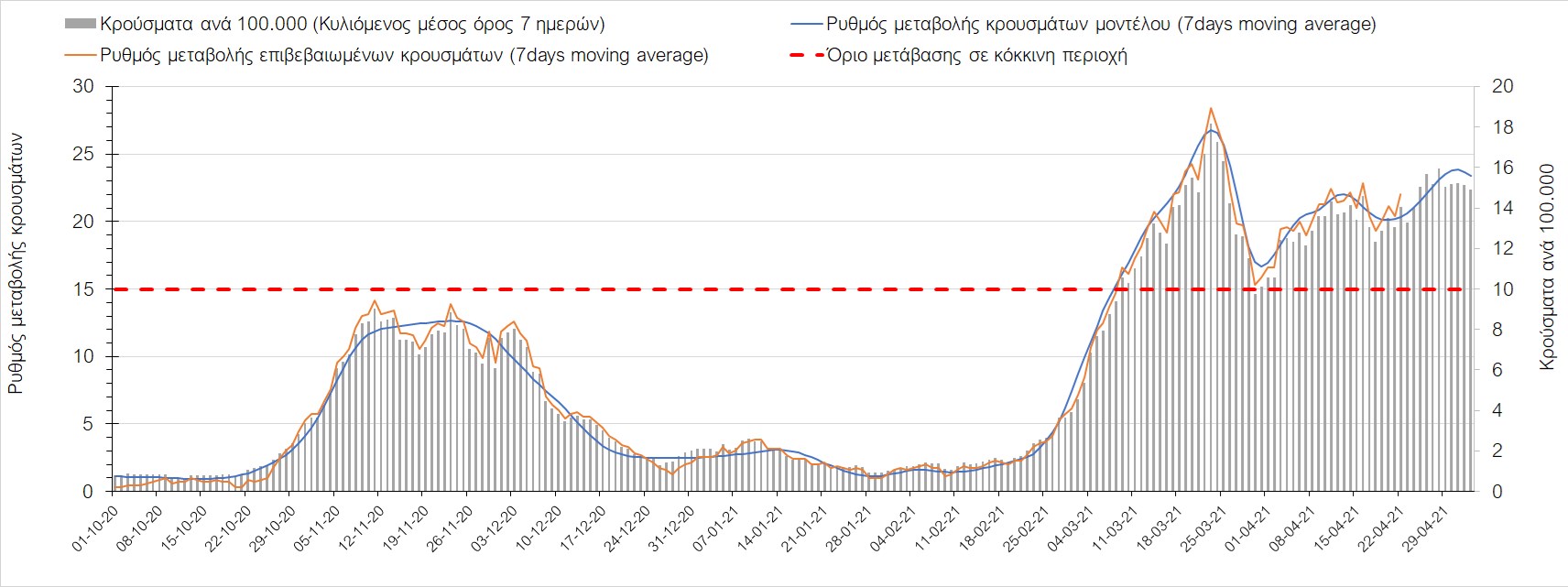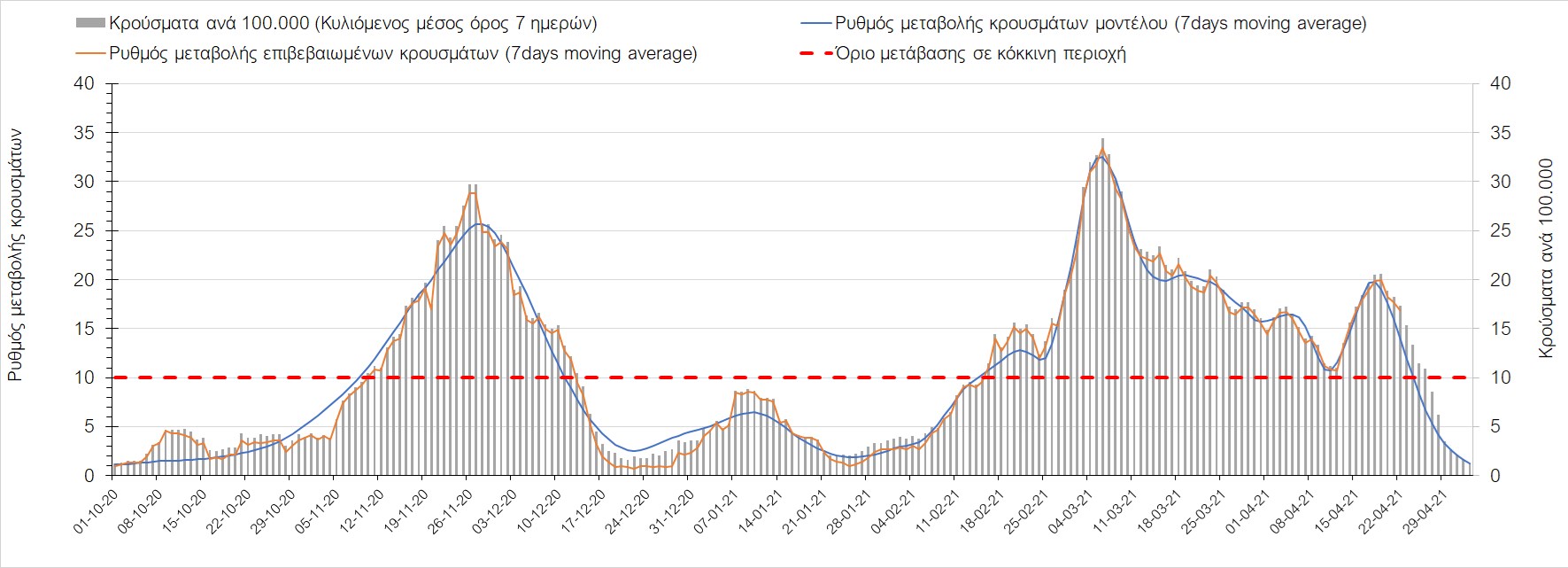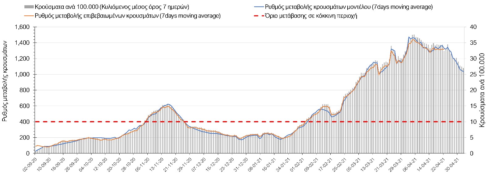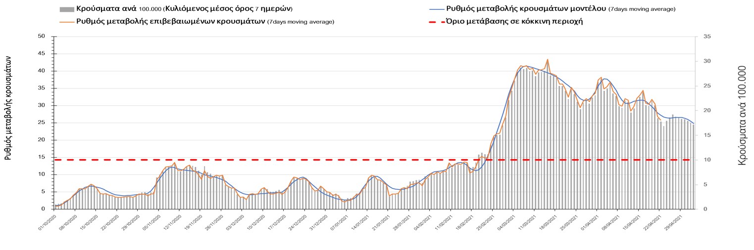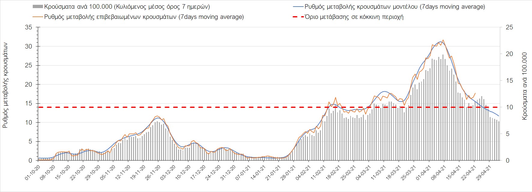 Σχήμα 52. Πορεία του ημερησίου αριθμού των κρουσμάτων (κυλιόμενος μέσος όρος 7 ημερών) στην ΘάσοΣυμπεράσματα:Με τα αποτελέσματα, της Πέμπτης διαφαίνεται κάμψη στον αριθμό των ασθενών σε κρίσιμη κατάσταση (διασωληνομένοι σε ΜΕΘ), η οποία θα εκφραστεί σύντομα και στον αριθμό των θανάτων. Οι προβλέψεις αυτές συνάδουν με τις προσομοιώσεις του μοντέλου CORE, όπως και ο αριθμός των κρουσμάτων, μετά και τις επικαιροποιημένες προβλέψεις προ 40 ημερών, όπου ελήφθη υπόψιν η μεγαλύτερη διασπορά των μεταλλαγμένων και ταχύτερα μεταδιδόμενων στελεχών. Σε πανελλαδικό επίπεδο ο κυλιόμενος εβδομαδιαίος μέσος όρος του δείκτη θετικότητας διαμορφώθηκε στο 5,4% (η ημερήσια τιμή είναι 4,4%) ενώ ο κυλιόμενος εβδομαδιαίος μέσος όρος του πραγματικού αριθμού αναπαραγωγής Rt (δηλαδή ο αριθμός των ατόμων που ένας φορέας μπορεί να επιμολύνει) διαμορφώθηκε στο 0,95 (τιμές του Rt κάτω από τη μονάδα υποδηλώνουν καθαρή μείωση της διασποράς του ιού στην κοινότητα). Η ταυτόχρονη μείωση και των δύο δεικτών, που παρατηρήθηκε τις προηγούμενες ημέρες και συνεχίζεται και αυτή την εβδομάδα, υποδηλώνει την κάμψη της ανοδικής τάσης στο σύνολο της χώρας (και κυρίως στην Αθήνα, ενώ αναμένεται να ακολουθήσει και η Θεσσαλονίκη). Η ήπια αναχαίτιση του 3ου κύματος που παρατηρείται, οφείλεται σε ένα συνδυασμό παραμέτρων, οι οποίες είναι η συνέχιση του lockdown, η χρήση των self-test, η αύξηση του αριθμού των τεστ από τον ΕΟΔΥ, γεγονός που συντελεί στην απομάκρυνση από τις αλυσίδες μετάδοσης τωνασυμπτωματικών και προσυμπτωματικών φορέων, η προοδευτική βελτίωση του καιρού και σε μικρότερο βαθμό η πρόοδος των εμβολιασμών, η σημασία των οποίων στον έλεγχο της πανδημίας θα αρχίσει να είναι πιο εμφανής από το τέλος του επόμενου μήνα. Όμως, με δεδομένο το άνοιγμα του λιανικού εμπορίου και των Λυκείων, είναι ακόμα πιο σημαντική η τήρηση των μέτρων, ενώ ύψιστης σημασίας στις επόμενες εβδομάδες θα αποδειχθεί η ορθή και μαζική εφαρμογή των self-test, με ταυτόχρονη αύξηση της ιχνηλασίας των επαφών των ανιχνευθέντων ως θετικοί και καραντίνα 14 ημερών για τους συμπολίτες μας που θα επιβεβαιωθεί ότι είναι θετικοί στην μόλυνση με SARS-CoV-2 ακόμη και αν είναι ασυμπτωματικοί. Δεδομένου ότι τελικά ο αριθμός των self-test που πραγματοποιούνται ημερησίως δεν έχει φθάσει στα επιθυμητά νούμερα στα οποία βασίζονται οι προβολές που παρουσιάζονται στην παρούσα τεχνική έκθεση μέχρι το Πάσχα, μόλις έχουμε νεώτερα για τον ακριβή αριθμό τους και τη συχνότητα εκτέλεσης αυτών, θα επαναεπικαιροποιήσουμε τις προβλέψεις μας. Αξίζει επίσης να σημειωθεί ότι στην Αθήνα τις τελευταίες ημέρες παρατηρήθηκαν συρροές, οι πιθανές επιπτώσεις των οποίων θα αποτυπωθούν στις επόμενες ημέρες. Τέλος, πολύ ισχυρές επιφυλάξεις έχουμε για το σχετικά πρόωρο άνοιγμα της εστίασης που αποφασίστηκε σήμερα για τις 3 Μαΐου, και που θα μπορούσε να συντελέσει σε προσωρινή αναστροφή της διαφαινόμενης σταθεροποιητικής/πτωτικής πορείας προς το τέλος του Μαΐου. Επιπλέον πρέπει να γίνει εντελώς καθαρό ότι το πρόωρο άνοιγμα της εστίασης θα συντελέσει σε αύξηση των επαφών (και άρα της μεταδοτικότητας), και όχι σε αποσυμπίεση των εικόνων συνωστισμού που παρατηρούμε τις τελευταίες ημέρες κυρίως σε περιοχές της Αθήνας, δεδομένου ότι η εστίαση θα δώσει την ευκαιρία αύξησης των επαφών σε ηλικιακές ομάδες που τώρα βρίσκονται εκτός των ηλικιών που συγχρωτίζονται.Παρά την 