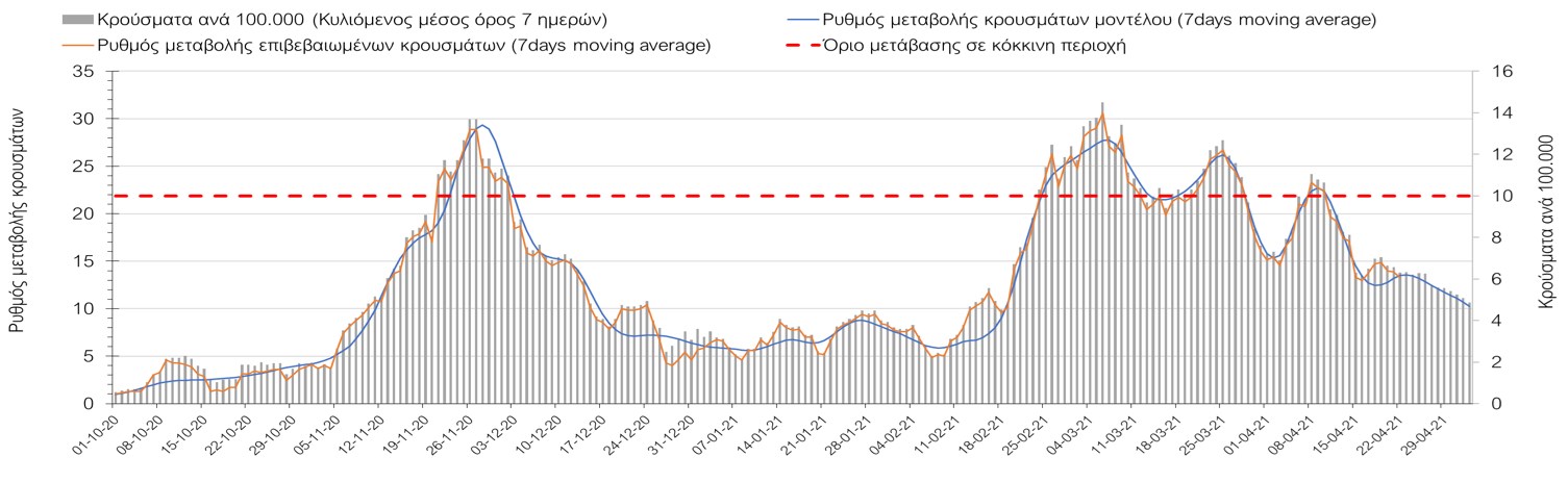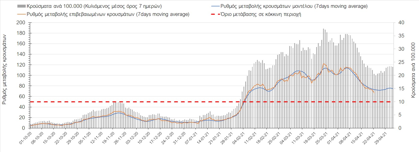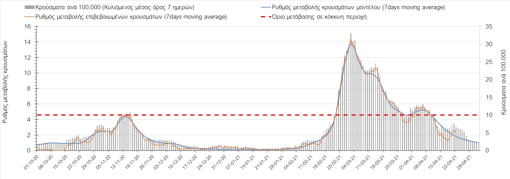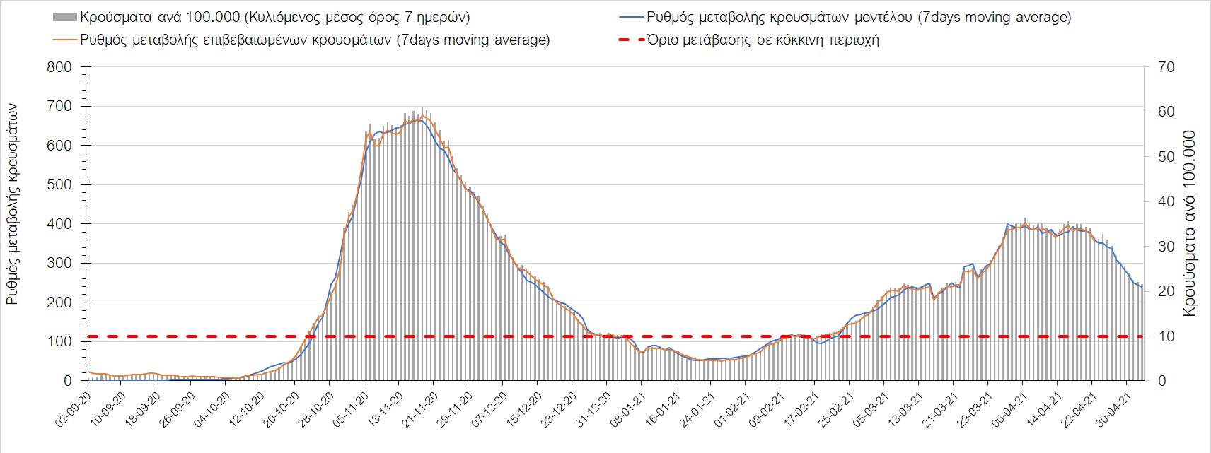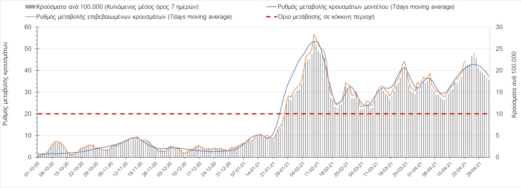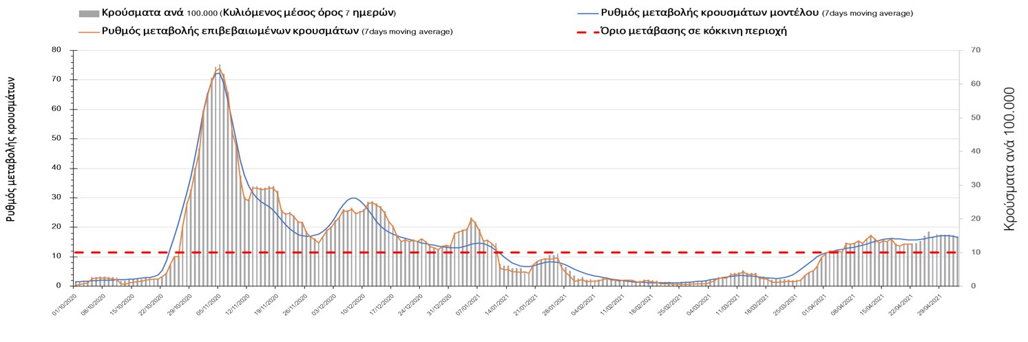 Σχήμα 52. Πορεία του ημερησίου αριθμού των κρουσμάτων (κυλιόμενος μέσος όρος 7 ημερών) στην ΘάσοΣυμπεράσματα:Με τα αποτελέσματα, της Πέμπτης διαφαίνεται κάμψη στον αριθμό των ασθενών σε κρίσιμη κατάσταση (διασωληνομένοι σε ΜΕΘ), η οποία θα εκφραστεί σύντομα και στον αριθμό των θανάτων. Οι προβλέψεις αυτές συνάδουν με τις προσομοιώσεις του μοντέλου CORE, όπως και ο αριθμός των κρουσμάτων, μετά και τις επικαιροποιημένες προβλέψεις προ 40 ημερών, όπου ελήφθη υπόψιν η μεγαλύτερη διασπορά των μεταλλαγμένων και ταχύτερα μεταδιδόμενων στελεχών. Σε πανελλαδικό επίπεδο ο κυλιόμενος εβδομαδιαίος μέσος όρος του δείκτη θετικότητας διαμορφώθηκε στο 5,4% (η ημερήσια τιμή είναι 4,4%) ενώ ο κυλιόμενος εβδομαδιαίος μέσος όρος του πραγματικού αριθμού αναπαραγωγής Rt (δηλαδή ο αριθμός των ατόμων που ένας φορέας μπορεί να επιμολύνει) διαμορφώθηκε στο 0,95 (τιμές του Rt κάτω από τη μονάδα υποδηλώνουν καθαρή μείωση της διασποράς του ιού στην κοινότητα). Η ταυτόχρονη μείωση και των δύο δεικτών, που παρατηρήθηκε τις προηγούμενες ημέρες και συνεχίζεται και αυτή την εβδομάδα, υποδηλώνει την κάμψη της ανοδικής τάσης στο σύνολο της χώρας (και κυρίως στην Αθήνα, ενώ αναμένεται να ακολουθήσει και η Θεσσαλονίκη). Η ήπια αναχαίτιση του 3ου κύματος που παρατηρείται, οφείλεται σε ένα συνδυασμό παραμέτρων, οι οποίες είναι η συνέχιση του lockdown, η χρήση των self-test, η αύξηση του αριθμού των τεστ από τον ΕΟΔΥ, γεγονός που συντελεί στην απομάκρυνση από τις αλυσίδες μετάδοσης τωνασυμπτωματικών και προσυμπτωματικών φορέων, η προοδευτική βελτίωση του καιρού και σε μικρότερο βαθμό η πρόοδος των εμβολιασμών, η σημασία των οποίων στον έλεγχο της πανδημίας θα αρχίσει να είναι πιο εμφανής από το τέλος του επόμενου μήνα. Όμως, με δεδομένο το άνοιγμα του λιανικού εμπορίου και των Λυκείων, είναι ακόμα πιο σημαντική η τήρηση των μέτρων, ενώ ύψιστης σημασίας στις επόμενες εβδομάδες θα αποδειχθεί η ορθή και μαζική εφαρμογή των self-test, με ταυτόχρονη αύξηση της ιχνηλασίας των επαφών των ανιχνευθέντων ως θετικοί και καραντίνα 14 ημερών για τους συμπολίτες μας που θα επιβεβαιωθεί ότι είναι θετικοί στην μόλυνση με SARS-CoV-2 ακόμη και αν είναι ασυμπτωματικοί. Δεδομένου ότι τελικά ο αριθμός των self-test που πραγματοποιούνται ημερησίως δεν έχει φθάσει στα επιθυμητά νούμερα στα οποία βασίζονται οι προβολές που παρουσιάζονται στην παρούσα τεχνική έκθεση μέχρι το Πάσχα, μόλις έχουμε νεώτερα για τον ακριβή αριθμό τους και τη συχνότητα εκτέλεσης αυτών, θα επαναεπικαιροποιήσουμε τις προβλέψεις μας. Αξίζει επίσης να σημειωθεί ότι στην Αθήνα τις τελευταίες ημέρες παρατηρήθηκαν συρροές, οι πιθανές επιπτώσεις των οποίων θα αποτυπωθούν στις επόμενες ημέρες. Τέλος, πολύ ισχυρές επιφυλάξεις έχουμε για το σχετικά πρόωρο άνοιγμα της εστίασης που αποφασίστηκε σήμερα για τις 3 Μαΐου, και που θα μπορούσε να συντελέσει σε προσωρινή αναστροφή της διαφαινόμενης σταθεροποιητικής/πτωτικής πορείας προς το τέλος του Μαΐου. Επιπλέον πρέπει να γίνει εντελώς καθαρό ότι το πρόωρο άνοιγμα της εστίασης θα συντελέσει σε αύξηση των επαφών (και άρα της μεταδοτικότητας), και όχι σε αποσυμπίεση των εικόνων συνωστισμού που παρατηρούμε τις τελευταίες ημέρες κυρίως σε περιοχές της Αθήνας, δεδομένου ότι η εστίαση θα δώσει την ευκαιρία αύξησης των επαφών σε ηλικιακές ομάδες που τώρα βρίσκονται εκτός των ηλικιών που συγχρωτίζονται.Παρά την 