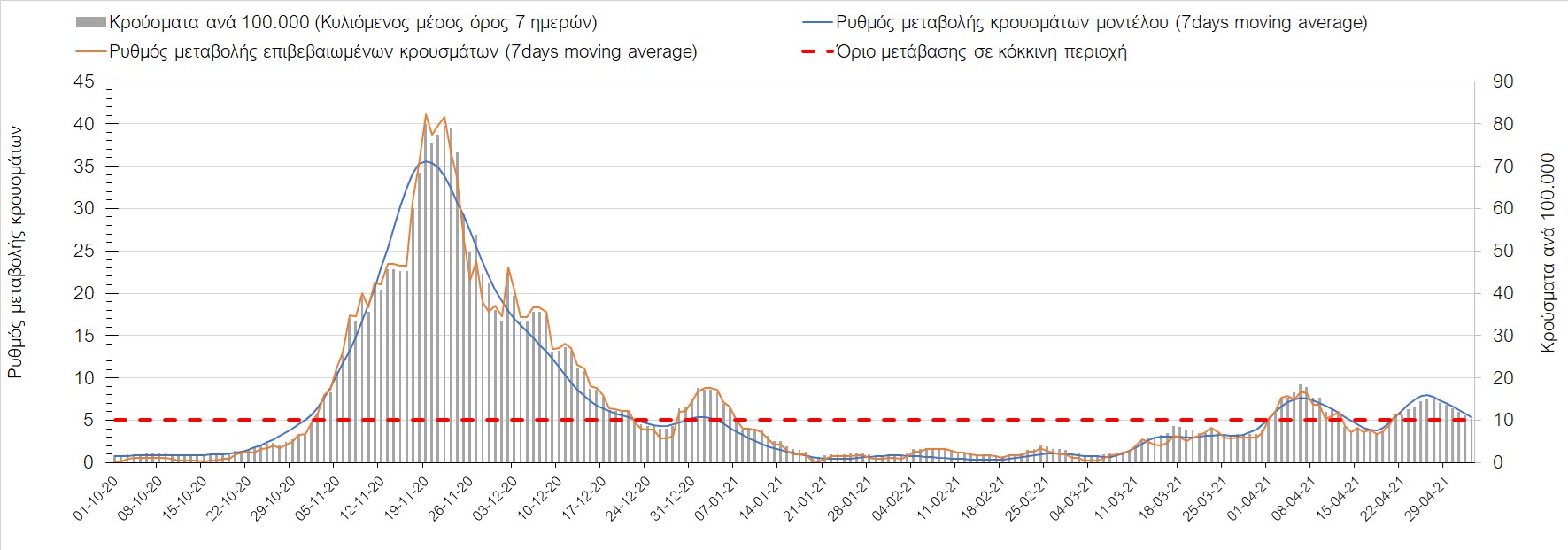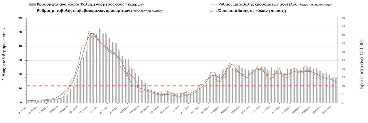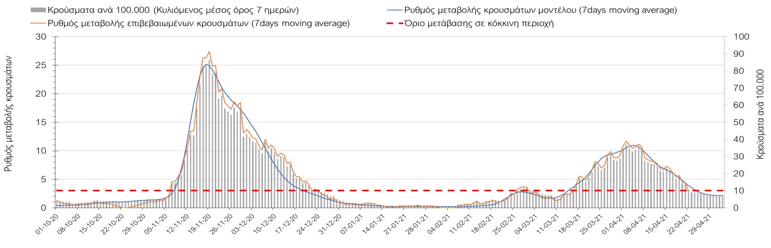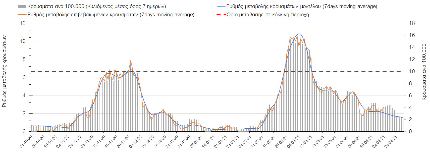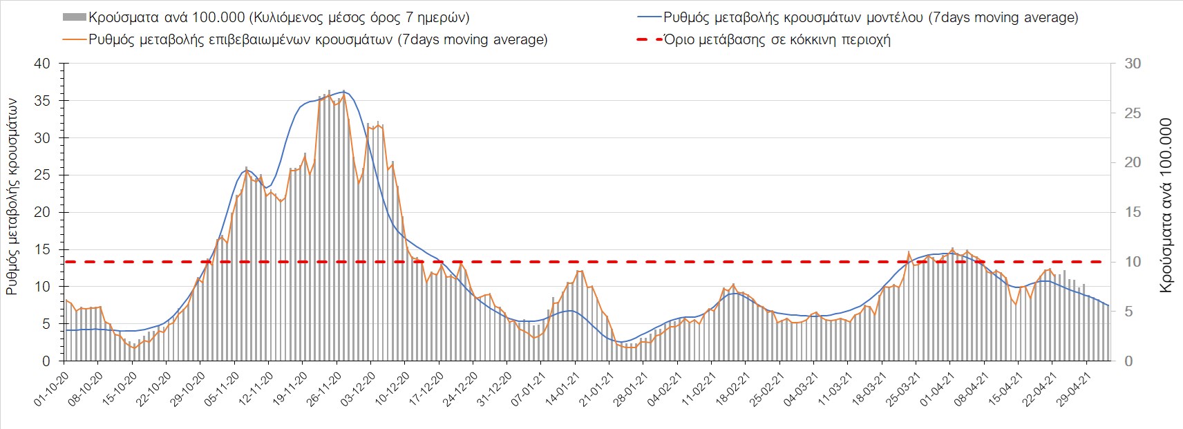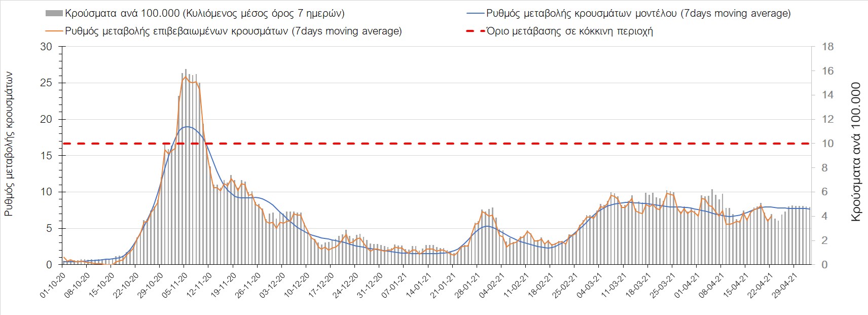Σχήμα 52. Πορεία του ημερησίου αριθμού των κρουσμάτων (κυλιόμενος μέσος όρος 7 ημερών) στην ΘάσοΣυμπεράσματα:Με τα αποτελέσματα, της Πέμπτης διαφαίνεται κάμψη στον αριθμό των ασθενών σε κρίσιμη κατάσταση (διασωληνομένοι σε ΜΕΘ), η οποία θα εκφραστεί σύντομα και στον αριθμό των θανάτων. Οι προβλέψεις αυτές συνάδουν με τις προσομοιώσεις του μοντέλου CORE, όπως και ο αριθμός των κρουσμάτων, μετά και τις επικαιροποιημένες προβλέψεις προ 40 ημερών, όπου ελήφθη υπόψιν η μεγαλύτερη διασπορά των μεταλλαγμένων και ταχύτερα μεταδιδόμενων στελεχών. Σε πανελλαδικό επίπεδο ο κυλιόμενος εβδομαδιαίος μέσος όρος του δείκτη θετικότητας διαμορφώθηκε στο 5,4% (η ημερήσια τιμή είναι 4,4%) ενώ ο κυλιόμενος εβδομαδιαίος μέσος όρος του πραγματικού αριθμού αναπαραγωγής Rt (δηλαδή ο αριθμός των ατόμων που ένας φορέας μπορεί να επιμολύνει) διαμορφώθηκε στο 0,95 (τιμές του Rt κάτω από τη μονάδα υποδηλώνουν καθαρή μείωση της διασποράς του ιού στην κοινότητα). Η ταυτόχρονη μείωση και των δύο δεικτών, που παρατηρήθηκε τις προηγούμενες ημέρες και συνεχίζεται και αυτή την εβδομάδα, υποδηλώνει την κάμψη της ανοδικής τάσης στο σύνολο της χώρας (και κυρίως στην Αθήνα, ενώ αναμένεται να ακολουθήσει και η Θεσσαλονίκη). Η ήπια αναχαίτιση του 3ου κύματος που παρατηρείται, οφείλεται σε ένα συνδυασμό παραμέτρων, οι οποίες είναι η συνέχιση του lockdown, η χρήση των self-test, η αύξηση του αριθμού των τεστ από τον ΕΟΔΥ, γεγονός που συντελεί στην απομάκρυνση από τις αλυσίδες μετάδοσης τωνασυμπτωματικών και προσυμπτωματικών φορέων, η προοδευτική βελτίωση του καιρού και σε μικρότερο βαθμό η πρόοδος των εμβολιασμών, η σημασία των οποίων στον έλεγχο της πανδημίας θα αρχίσει να είναι πιο εμφανής από το τέλος του επόμενου μήνα. Όμως, με δεδομένο το άνοιγμα του λιανικού εμπορίου και των Λυκείων, είναι ακόμα πιο σημαντική η τήρηση των μέτρων, ενώ ύψιστης σημασίας στις επόμενες εβδομάδες θα αποδειχθεί η ορθή και μαζική εφαρμογή των self-test, με ταυτόχρονη αύξηση της ιχνηλασίας των επαφών των ανιχνευθέντων ως θετικοί και καραντίνα 14 ημερών για τους συμπολίτες μας που θα επιβεβαιωθεί ότι είναι θετικοί στην μόλυνση με SARS-CoV-2 ακόμη και αν είναι ασυμπτωματικοί. Δεδομένου ότι τελικά ο αριθμός των self-test που πραγματοποιούνται ημερησίως δεν έχει φθάσει στα επιθυμητά νούμερα στα οποία βασίζονται οι προβολές που παρουσιάζονται στην παρούσα τεχνική έκθεση μέχρι το Πάσχα, μόλις έχουμε νεώτερα για τον ακριβή αριθμό τους και τη συχνότητα εκτέλεσης αυτών, θα επαναεπικαιροποιήσουμε τις προβλέψεις μας. Αξίζει επίσης να σημειωθεί ότι στην Αθήνα τις τελευταίες ημέρες παρατηρήθηκαν συρροές, οι πιθανές επιπτώσεις των οποίων θα αποτυπωθούν στις επόμενες ημέρες. Τέλος, πολύ ισχυρές επιφυλάξεις έχουμε για το σχετικά πρόωρο άνοιγμα της εστίασης που αποφασίστηκε σήμερα για τις 3 Μαΐου, και που θα μπορούσε να συντελέσει σε προσωρινή αναστροφή της διαφαινόμενης σταθεροποιητικής/πτωτικής πορείας προς το τέλος του Μαΐου. Επιπλέον πρέπει να γίνει εντελώς καθαρό ότι το πρόωρο άνοιγμα της εστίασης θα συντελέσει σε αύξηση των επαφών (και άρα της μεταδοτικότητας), και όχι σε αποσυμπίεση των εικόνων συνωστισμού που παρατηρούμε τις τελευταίες ημέρες κυρίως σε περιοχές της Αθήνας, δεδομένου ότι η εστίαση θα δώσει την ευκαιρία αύξησης των επαφών σε ηλικιακές ομάδες που τώρα βρίσκονται εκτός των ηλικιών που συγχρωτίζονται.Παρά την 