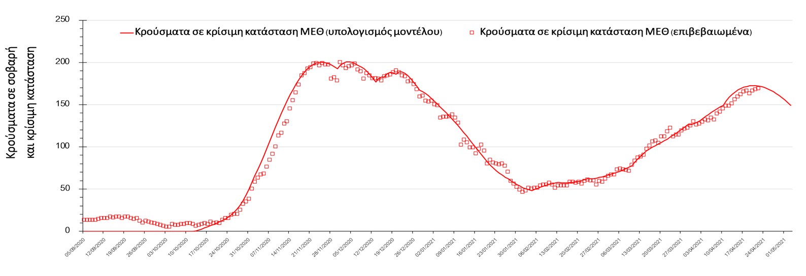 Σύμφωνα με τα στοιχεία του ΕΟΔΥ, ο αριθμός κρουσμάτων της Πέμπτης ανέρχεται στα 2759 νέα κρούσματα, με τα αποτελέσματα να συνάδουν με τις προβλέψεις της υπολογιστικής πλατφόρμας CORE (n=2788). Ο αριθμός των τεστ που πραγματοποιήθηκαν ήταν 63048 και σε συνδυασμό με τον αριθμό των κρουσμάτων, ο δείκτης θετικότητας διαμορφώθηκε στο 4,4%. Η πραγματοποίηση αριθμού τεστ σε επίπεδα άνω των 50.000 την ημέρα (όπως και πραγματοποιείται τις τελευταίες ημέρες), συντελεί στο να εξάγουμε πιο ασφαλή συμπεράσματα σχετικά με την πορεία της πανδημίας, αλλά και να εντοπίζονται περισσότεροι ασυμπτωματικοί και προσυμπτωματικοί, συντελώντας στον περιορισμό της πανδημίας. Γενικά όμως θα πρέπει να αυξηθεί κι άλλο ο αριθμός των τεστ ανίχνευσης του SARS-CoV-2 χρησιμοποιώντας τα rapid test και τα fast test για να καταπολεμηθεί η δυναμική αύξησης της διασποράς στις περιοχές όπου μια τέτοια αύξηση διαφαίνεται από τα μέχρι τώρα δεδομένα και την υπολογιστική πλατφόρμα CORE.Ο αριθμός ημερήσιων θανάτων (75) είναι μειωμένος σε σχέση με προχθές (86) και όπως είχαμε προβλέψει από την προηγούμενη εβδομάδα, ο κυλιόμενος εβδομαδιαίος μέσος όρος που την Πέμπτη είναι 78 αναμένεται να συνεχίσει να αυξάνεται μέχρι τα τέλη της επόμενης εβδομάδας, με δεδομένη την αύξηση του αριθμού των διασωληνωμένων, και παρά τη διαφαινόμενη μέχρι τώρα σταθεροποίηση του αριθμού των κρουσμάτων.Όσον αφορά στους ασθενείς σε κρίσιμη κατάσταση (διασωληνωμένοι σε ΜΕΘ), την Πέμπτη ο αριθμός τους μειώθηκε σε σχέση με προχθές (822 από 831), και διαφαίνεται να έχει ξεκινήσει η αποκλιμάκωση με βάση την επικαιροποιημένη πρόβλεψη (αυτό βέβαια με την παραδοχή ότι θα συνεχίσουν να τηρούνται τα ισχύοντα μέτρα, συμπεριλαμβανομένων των προβλεπόμενων self-test και δεν θα πραγματοποιηθούν άμεσα και χωρίς την κατάλληλη προετοιμασία ανοίγματα δραστηριοτήτων υψηλού συγχρωτισμού, όπως τα mall και η εστίαση). Αξίζει να σημειωθεί ότι ο αριθμός των ασθενών σε κρίσιμη κατάσταση όπως και των θανάτων είναι αναλογικά χαμηλότερος σε σχέση με τα αντίστοιχα μεγέθη στο δεύτερο κύμα, τόσο λόγω των εμβολιασμών ευπαθών ομάδων, όσο και του υψηλότερου αριθμού τεστ ανίχνευσης, που συντελεί στον εντοπισμό περισσότερων ασυμπτωματικών ή ήπια συμπτωματικών κρουσμάτων. Επίσης, η διασπορά των μεταλλαγμένων στελεχών που έχουν μεγαλύτερη μεταδοτικότητα από το στέλεχος του SARS-CoV-2 που κυριαρχούσε μέχρι το τέλος Φεβρουαρίου και η αυξημένη κινητικότητα του πληθυσμού έχουν μεγαλώσει το ποσοστό των νεότερων ηλικιών που μολύνονται με αποτέλεσμα η μέση ηλικία των μολύνσεων να έχει πέσει σημαντικά. Η καμπύλη εξέλιξης του αριθμού των ασθενών που νοσηλεύονται σε κλίνες ΜΕΘ με βάση τις προσομοιώσεις της πλατφόρμας CORE, όπως αυτή παρουσιάζεται στο Σχήμα 1, των ασθενών που νοσηλεύονται σε απλές κλίνες στο Σχήμα 2, ενώ μια εκτίμηση για την πορεία των θανάτων ανά ημέρα παρουσιάζεται στο Σχήμα 3. Σχήμα 1. Αριθμός κρουσμάτων σε κρίσιμη κατάσταση (ΜΕΘ) σύμφωνα με τα στοιχεία του ΕΟΔΥ και τις προβλέψεις της υπολογιστικής πλατφόρμας CORE.