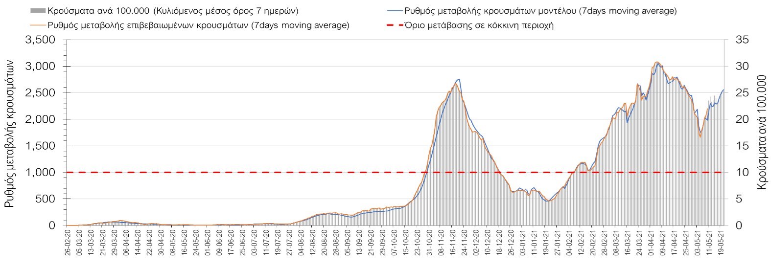 Πορεία του ημερησίου αριθμού των κρουσμάτων (κυλιόμενος μέσος όρος 7 ημερών) στην Ελληνική επικράτεια