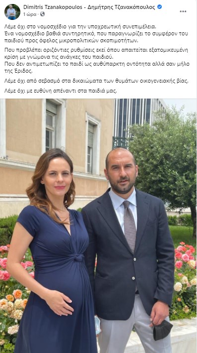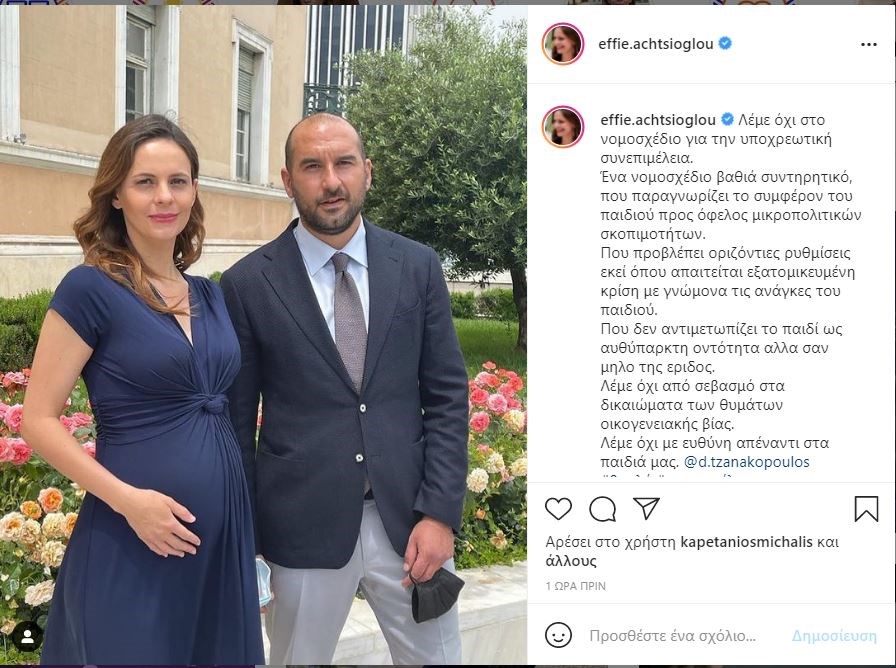 Την αντίθεσή τους στο νομοσχέδιο για τη συνεπιμέλεια εξέφρασαν η Έφη Αχτσιόγλου και ο Δημήτρης Τζανακόπουλος, επιλέγοντας, μάλιστα, να ανεβάσουν μία κοινή τους φωτογραφία στους λογαριασμούς τους στα social media. Η βουλευτής και υπεύθυνη του Τομέα Οικονομικών του ΣΥΡΙΖΑ ποζάρει με φουσκωμένη κοιλίτσα, καθώς βρίσκεται σε προχωρημένη εγκυμοσύνη.