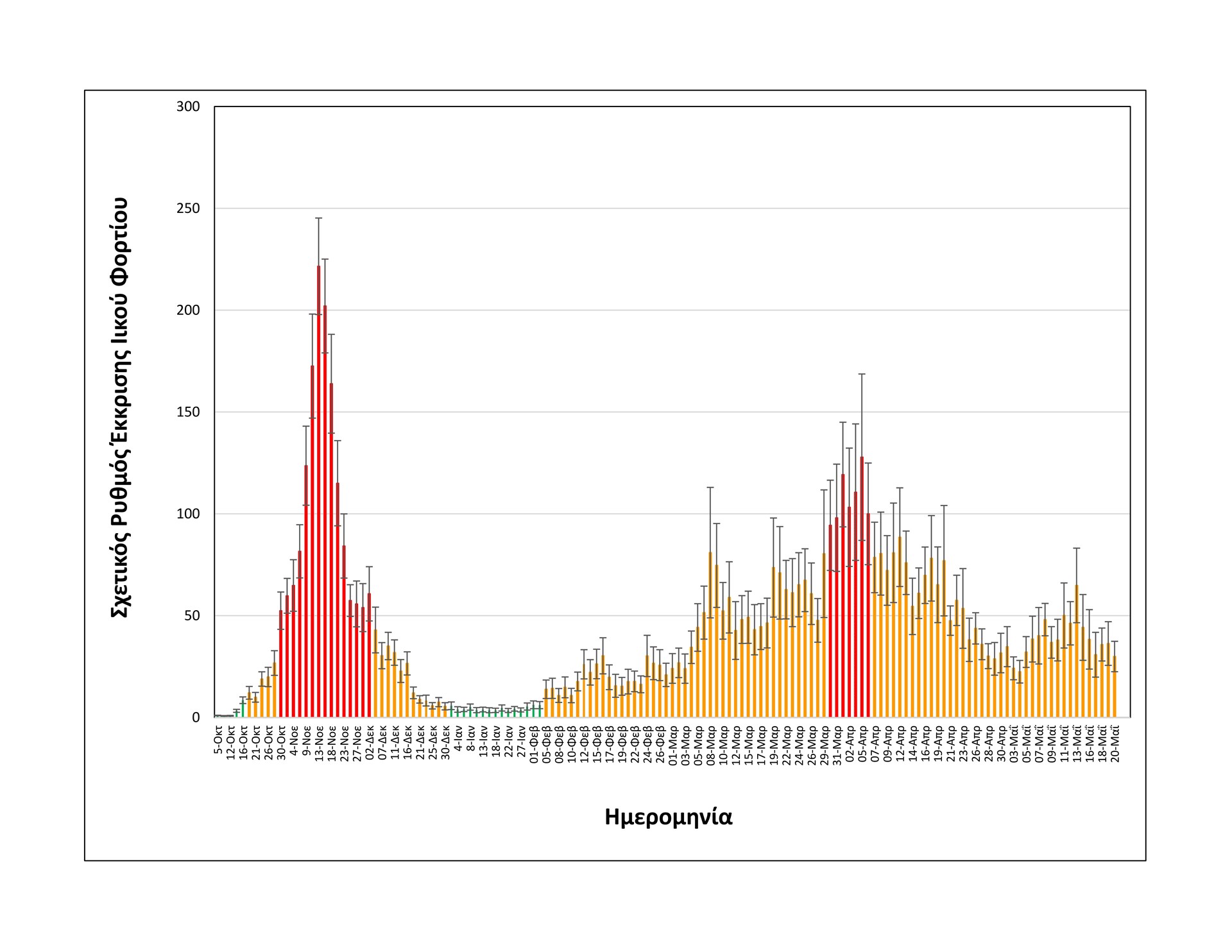 Όπως φαίνεται στα διαγράμματα που παρουσιάζει το ΑΠΕ – ΜΠΕ από την αρχή της εβδομάδας το ιικό φορτίο μετράται στα ίδια επίπεδα, με μικρές αυξομειώσεις μεταξύ των ημερών έως και την Πέμπτη. Συγκεκριμένα, στα δείγματα που λαμβάνονται καθημερινά στην είσοδο της Εγκατάστασης Επεξεργασίας Λυμάτων Θεσσαλονίκης, αναφορικά με τις εξορθολογισμένες τιμές σχετικής έκκρισης ιικού φορτίου, η μέση τιμή των δύο πιο πρόσφατων μετρήσεων, δηλαδή της Τετάρτης 19/05 και της Πέμπτης 20/05 είναι: