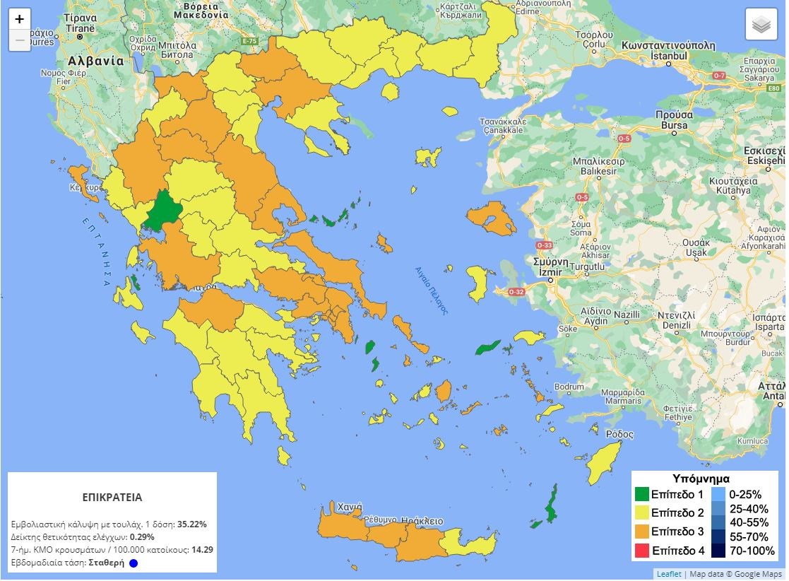Στα δύο υψηλότερα επίπεδα (πορτοκαλί και κόκκινο) προβλέπονται μέτρα Δημόσιας Υγείας σε επίπεδο ΠΕ ή Δήμου.