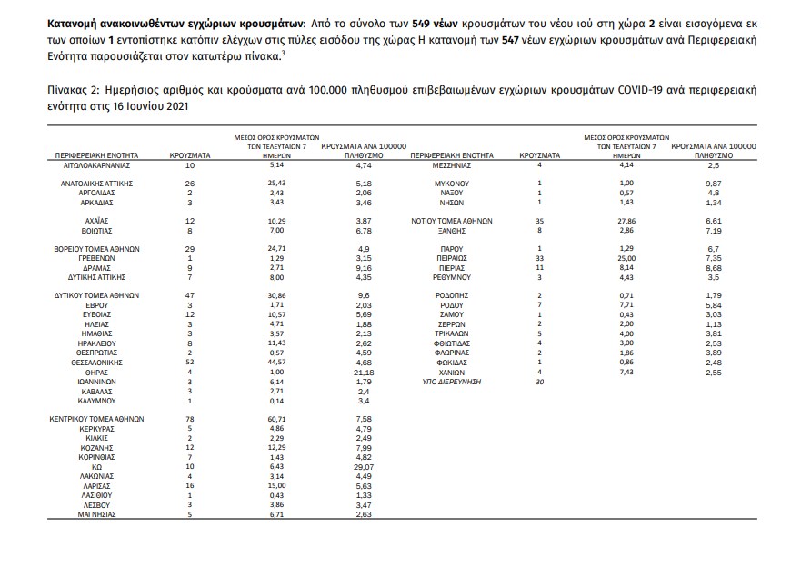 Ο ΕΟΔΥ ανακοίνωσε το απόγευμα της Τετάρτης ότι το τελευταίο 24ωρο καταγράφηκαν στη χώρα μας 549 κρούσματα κορονοϊού.Από το σύνολο των νέων κρουσμάτων, τα 2 είναι εισαγόμενα εκ των οποίων 1 εντοπίστηκε κατόπιν ελέγχων στις πύλες εισόδου της χώρας. Η κατανομή των 547 νέων εγχώριων κρουσμάτων ανά Περιφερειακή Ενότητα παρουσιάζεται στον παρακάτω πίνακα. Με βάση τα επίσημα στοιχεία του ΕΟΔΥ, 256 νέα κρούσματα στην Αττική καταγράφονται, ενώ 52 στη Θεσσαλονίκη. Επίσης διψήφιος αριθμός κρουσμάτων εντοπίζεται στη Λάρισα (16), στην Αχαΐα (12), στην Εύβοια (12), στην Κοζάνη (12) , στην Κω (10), στην Αιτωλοακαρνανία (10) και στην Πιερία (11).