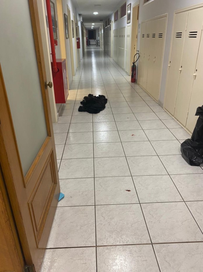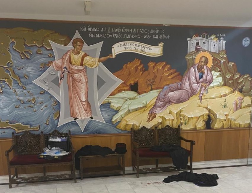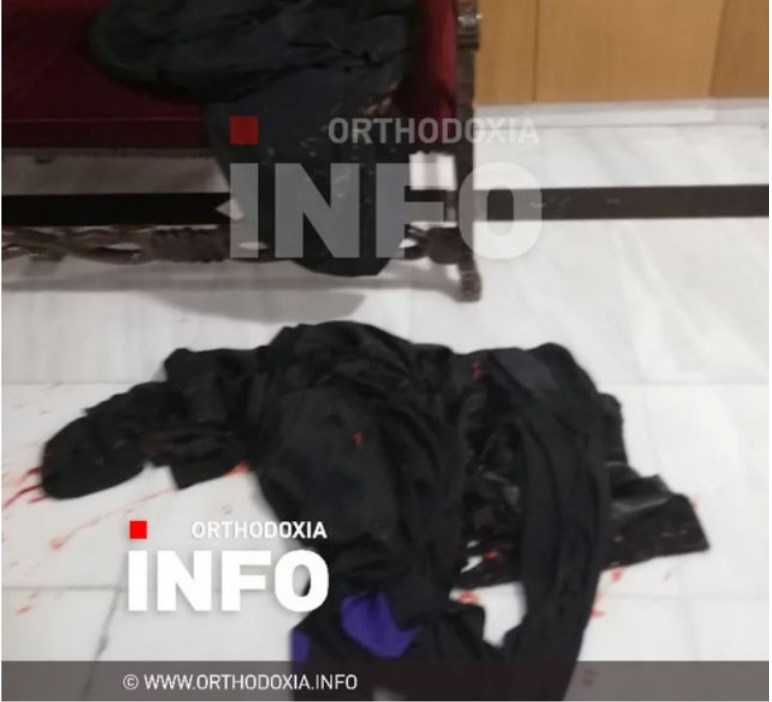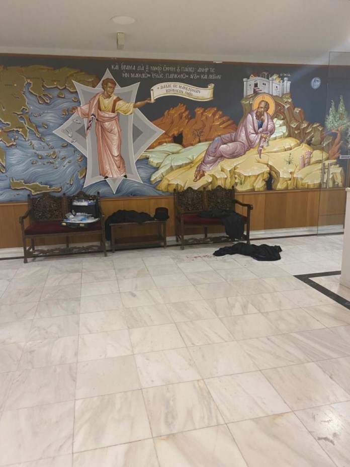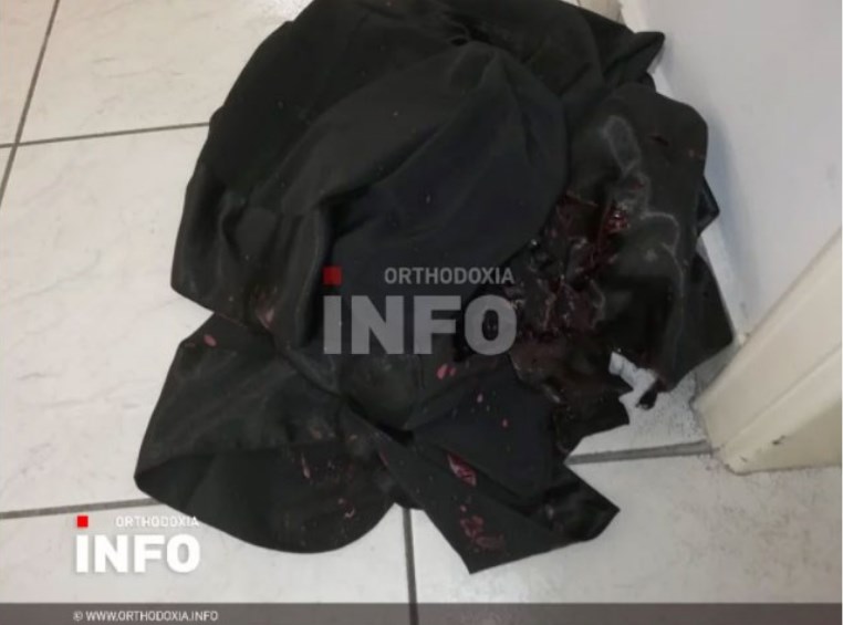 Φωτογραφίες από τον χώρο όπου σημειώθηκε η επίθεση με βιτριόλι κατά 7 μητροπολιτών και άλλων προσώπων παρουσίασε η ΕΡΤ και το orthodoxia.info. Ράσα που έχουν αφεθεί στον χώρο, πάνω σε καρέκλες και στο δάπεδο ενώ σε κάποια από αυτά υπάρχει αίμα.