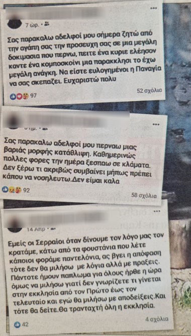 Ο ιερέας είχε κάνει αναρτήσεις στον λογαριασμό του στο Facebook, στις οποίες έκανε αναφορά για “κατάθλιψη”. Σύμφωνα με το ρεπορτάζ που δημοσιεύει η εφημερίδα “Δημοκρατία”, στις 14 Απριλίου έγραψε στο προφίλ του: “Εμείς οι Σερραίοι όταν δίνουμε τον λόγο μας, τον κρατάμε. Κάτω από τα φουστάνια που λέτε κάποιοι, φοράμε παντελόνια. Ας βγει η απόφαση και τότε δεν θα μιλήσω με λόγια αλλά με πράξεις. Πάντοτε ήμουν πάπλωμα για όλους. Ήρθε η ώρα όμως να μιλήσω, γιατί δεν γνωρίζετε τι γίνεται στην Εκκλησία από τον πρώτο έως τον τελευταίο. Και εγώ θα μιλήσω με αποδείξεις. Και τότε θα δείτε. Θα τρανταχθεί όλη η Εκκλησία”. Στην τελευταία ανάρτησή του περίπου πέντε ώρες πριν από την επίθεση, ο ιερέας αναφέρει “σας παρακαλώ αδελφοί μου, σήμερα ζητώ την αγάπη σας, την προσευχή σας σε μια μεγάλη δοκιμασία που περνώ, πείτε ένα κύριε ελέησον. Κάντε ένα κομποσχοίνι, μια παράκληση, το έχω μεγάλη ανάγκη. Να είστε ευλογημένοι. Η Παναγία να σας σκεπάζει. Ευχαριστώ πολύ”. “Σας παρακαλώ αδελφοί μου, περνάω μιας βαριάς μορφής κατάθλιψη. Καθημερινώς πολλές φορές την ημέρα ξεσπάω σε κλάματα. Δεν ξέρω τι ακριβώς συμβαίνει, μήπως πρέπει να κάπου να νοσηλευτώ. Δεν είμαι καλά” περιγράφει σε άλλη ανάρτησή του, η οποία είχε και 58 σχόλια, καθώς όσοι ήταν φίλοι του στα μέσα κοινωνικής δικτύωσης ανησύχησαν με όσα έγραφε.