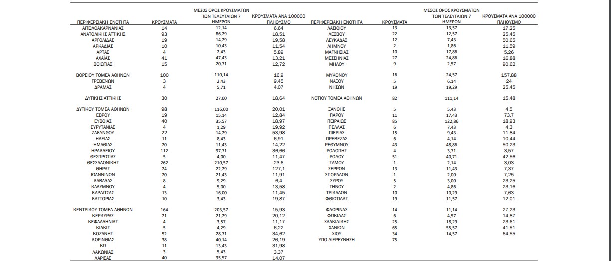 Έτσι βάσει της κατανομής των 2.056 νέων εγχώριων κρουσμάτων, τα 671 εντοπίστηκαν στην Αττική, 262 στη Θεσσαλονίκη, ενώ υψηλά νούμερα καταγράφονται και στην Κρήτη. Συγκεκριμένα, στο Ηράκλειο εντοπίστηκαν 112 νέες μολύνσεις, στο Λασίθι 13, στο Ρέθυμνο 43 και στα Χανιά 65.
