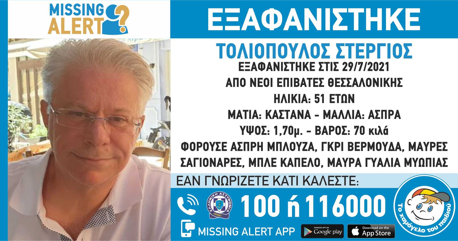 Συναγερμός έχει σημάνει στις αρχές για την εξαφάνιση του Στέργιου Τολιόπουλου, από την περιοχή των Νέων Επιβατών Θεσσαλονίκης. Τα ίχνη του 51χρονου χάθηκαν στις 30 Ιουλίου. Το «Χαμόγελο του Παιδιού» ενημερώθηκε για την εξαφάνισή του και προχώρησε στη δημοσιοποίηση των στοιχείων του ενήλικου κατόπιν αιτήματος των οικείων του, καθώς ενδέχεται να συντρέχουν λόγοι οι οποίοι θέτουν τη ζωή του σε κίνδυνο.