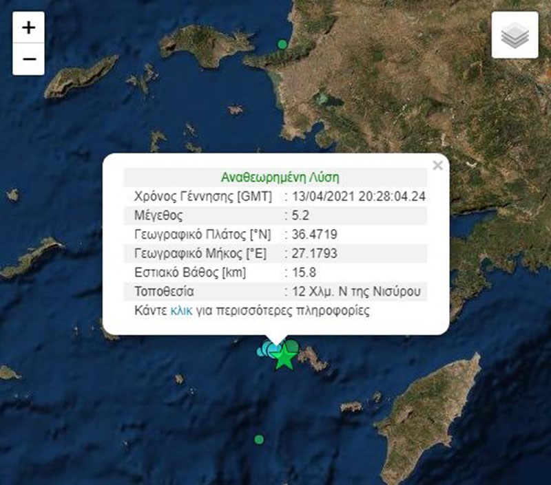 Σεισμική δόνηση μεγέθους 5,2 βαθμών της κλίμακας ρίχτερ σημειώθηκε πριν από λίγα λεπτά ανάμεσα σε Τήλο και Νίσυρο. Το επίκεντρο του σεισμού σύμφωνα με το Γεωδυναμικό Ινστιτούτο εντοπίστηκε 12 χιλιόμετρα νότια της Νισύρου. Το εστιακό του βάθος μετρήθηκε στα 15,8 χιλιόμετρα.
