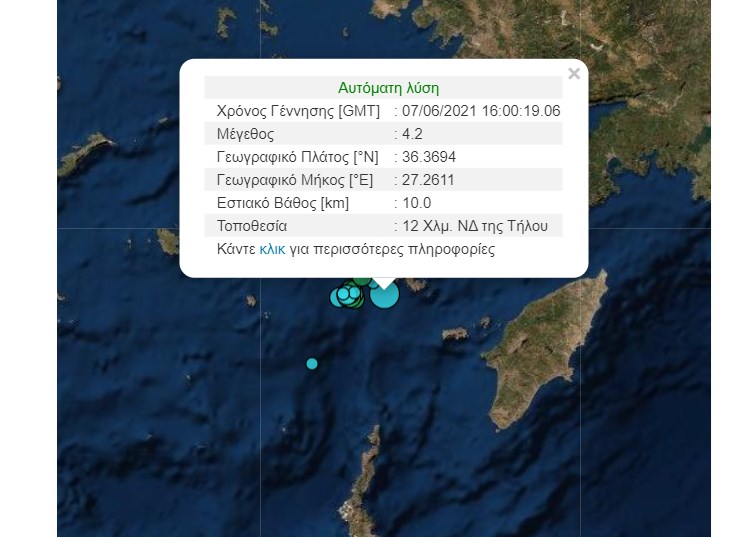 Ισχυρός σεισμός σημειώθηκε στην Τήλο. Σύμφωνα με το Γεωδυναμικό Ινστιτούτο, ο σεισμός είχε μέγεθος 4,2 βαθμών της κλίμακας Ρίχτερ και είχε επίκεντρο 12 χλμ νοτιοδυτικά της Τήλου. Το εστιακό βάθος υπολογίζεται σε 10 χλμ.