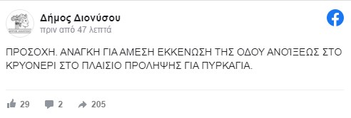 Το μήνυμα αναφέρει: «Αν βρίσκεστε στην Οδό #Ανοίξεως πλησίον της δασικής έκτασης #Κρυονερίου εκκενώστε τώρα προς την Ε.Ο. #Αθηνών -Λαμίας μέσω Λεωφόρου Κρυονερίου. Δασική πυρκαγιά στην περιοχή σας»
