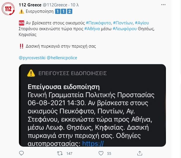 Πριν από λίγο, εστάλη εκ νέου μήνυμα σε όσους βρίσκονται στον Οικισμό Πευκόφυτου ή τον Οικισμό Ποντίων, στον Άγιο Στέφανο, να απομακρυνθούν άμεσα και να κινηθούν προς την Αθήνα, μέσω Λεωφόρου Θησέως, Κηφισίας.