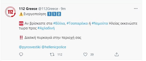 Η φωτιά στην Ηλεία δεν έχει σταματημό. Πριν από λίγο εστάλη μήνυμα μέσω του “112” για εκκένωση των οικισμών Βίλλια, Τσαπαρέϊκα και Νεμούτα. Όπως αναφέρει “αν βρίσκεστε στα Βίλλια, Τσαπαρέικα ή Νεμούτα Ηλείας εκκενώστε τώρα προς Αχλαδινή. Δασική πυρκαγιά στην περιοχή σας».