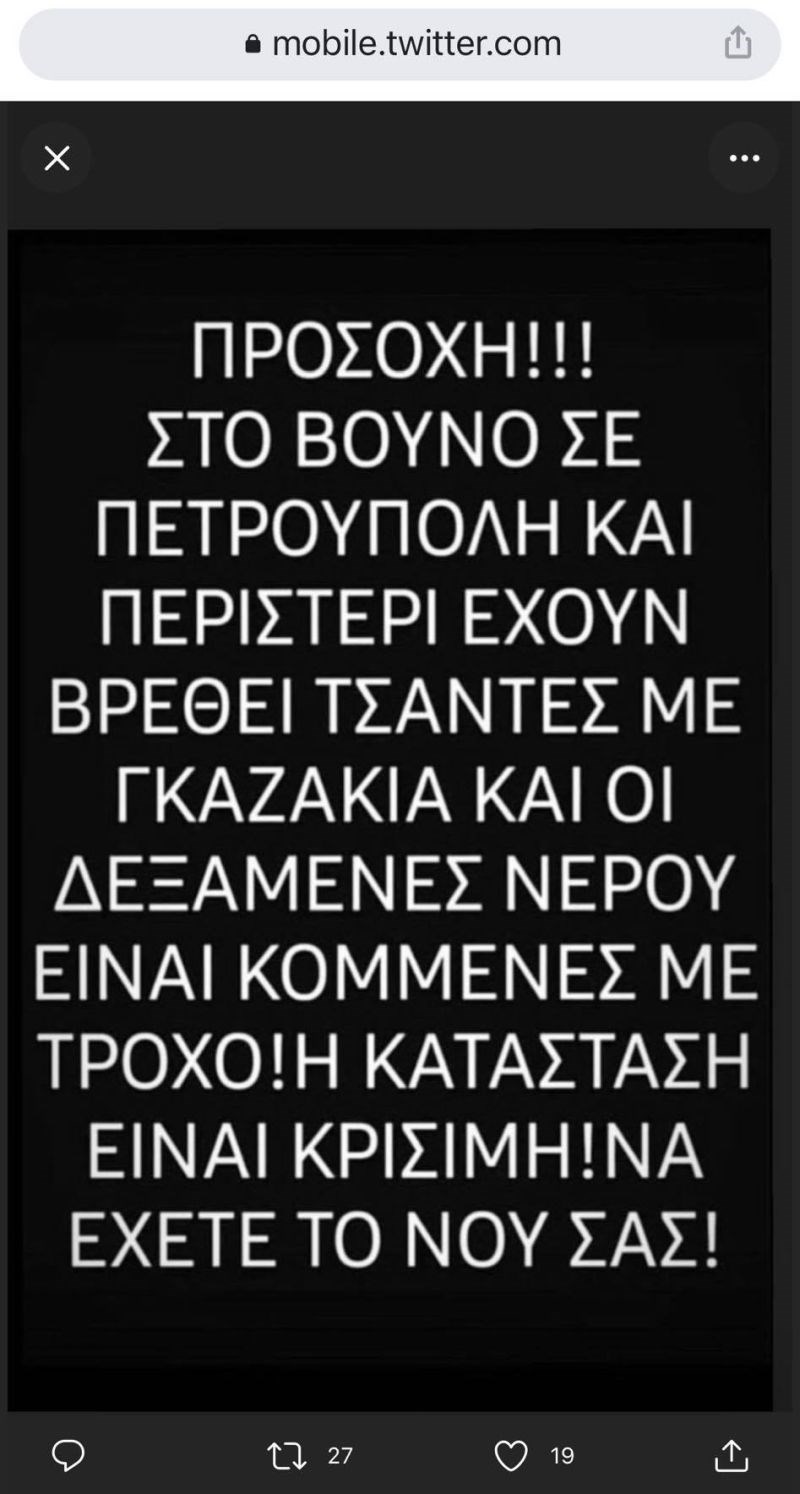 Την ίδια στιγμή, όπως καταγγέλλεται στα social media υπήρξαν αναφορές για το βουνό πάνω από την Πετρούπολη και το Περιστέρι, σύμφωνα με τις οποίες βρέθηκαν τσάντες με γκαζάκια ενώ και οι δεξαμενές νερού που υπάρχουν στην περιοχή για την κατάσβεση τυχόν πυρκαγιών, έχουν κοπεί με τροχό έτσι ώστε να μην μπορούν να αντλήσουν το νερό οι πυροσβεστικές δυνάμεις.