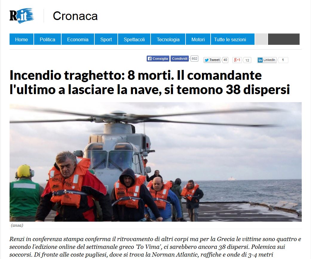 Σύμφωνα με τελευταία ενημέρωση της ιταλικής La Repubblica, οι νεκροί από το Norman Atlantic είναι 8, ενώ υπάρχουν φόβοι για 38 αγνοούμενους.