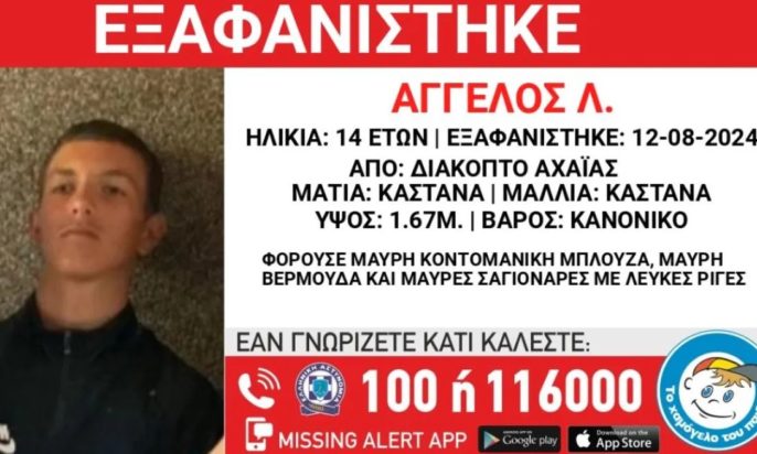 Συναγερμός έχει σημάνει στο Διακοπτό Αχαΐας για την εξαφάνιση του 12χρονου Άγγελου Λ, το βράδυ της Δευτέρας (12/8).