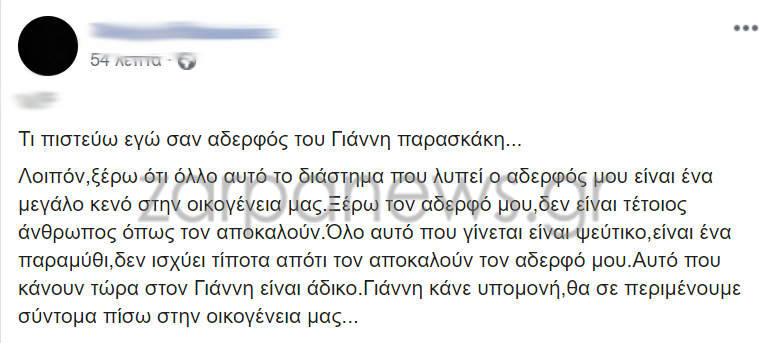 Όλο αυτό που γίνεται είναι ψεύτικο, είναι ένα παραμύθι, δεν ισχύει τίποτα απ’ότι τον αποκαλούν τον αδερφό μου. Αυτό που κάνουν τώρα στον Γιάννη είναι άδικο. Γιάννη κάνε υπομονή, θα σε περιμένουμε σύντομα πίσω στην οικογένεια μας…».