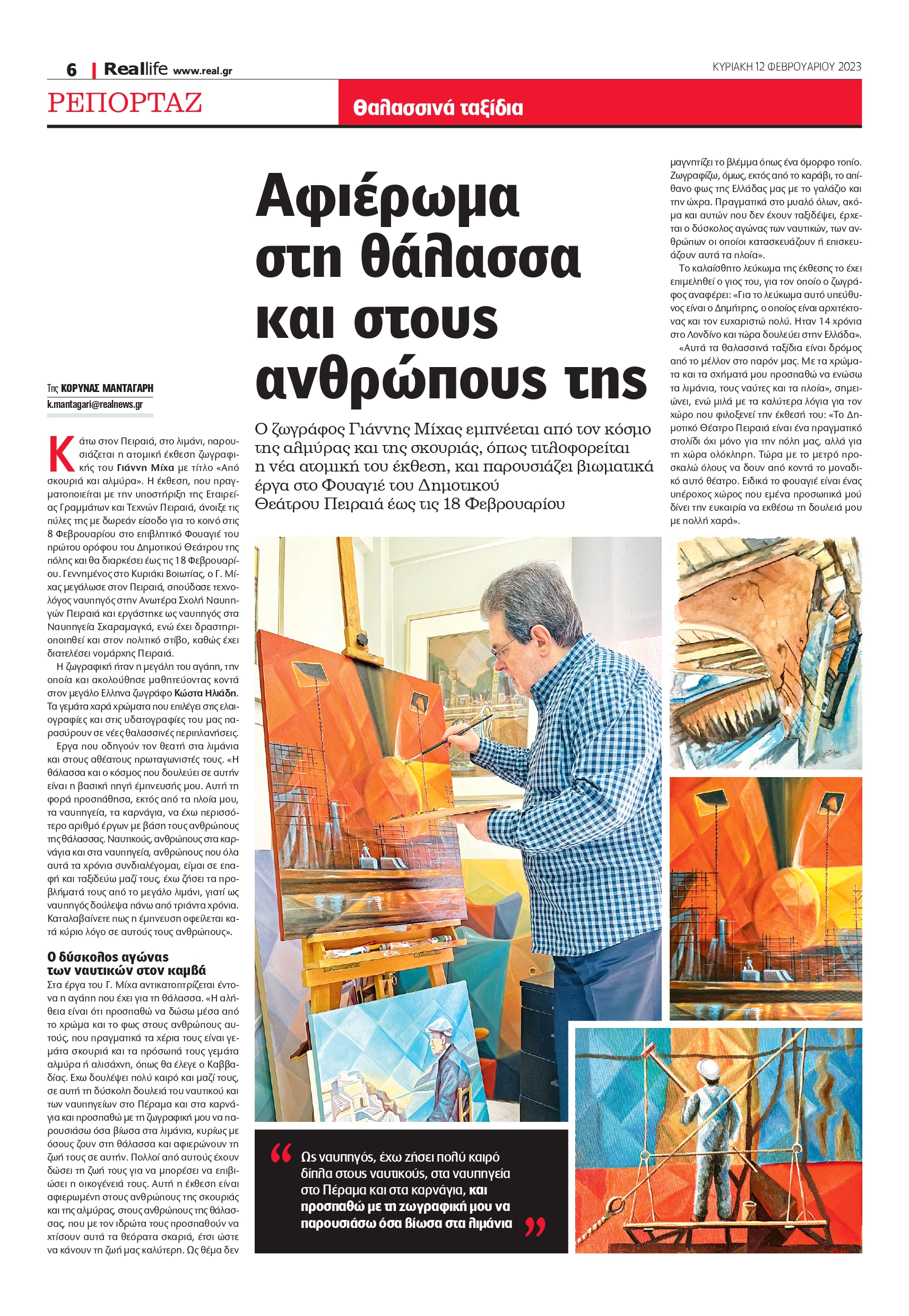 Κάτω στον Πειραιά, στο λιμάνι, παρουσιάζεται η ατομική έκθεση ζωγραφικής του Γιάννη Μίχα με τίτλο «Aπό σκουριά και αλμύρα». Η έκθεση, που πραγματοποιείται με την υποστήριξη της Εταιρείας Γραμμάτων και Τεχνών Πειραιά, άνοιξε τις πύλες της με δωρεάν είσοδο για το κοινό στις 8 Φεβρουαρίου στο επιβλητικό Φουαγιέ του πρώτου ορόφου του Δημοτικού Θεάτρου της πόλης και θα διαρκέσει έως τις 18 Φεβρουαρίου. Γεννημένος στο Κυριάκι Βοιωτίας, ο Γ. Μίχας μεγάλωσε στον Πειραιά, σπούδασε τεχνολόγος ναυπηγός στην Ανωτέρα Σχολή Ναυπηγών Πειραιά και εργάστηκε ως ναυπηγός στα Ναυπηγεία Σκαραμαγκά, ενώ έχει δραστηριοποιηθεί και στον πολιτικό στίβο, καθώς έχει διατελέσει νομάρχης Πειραιά.