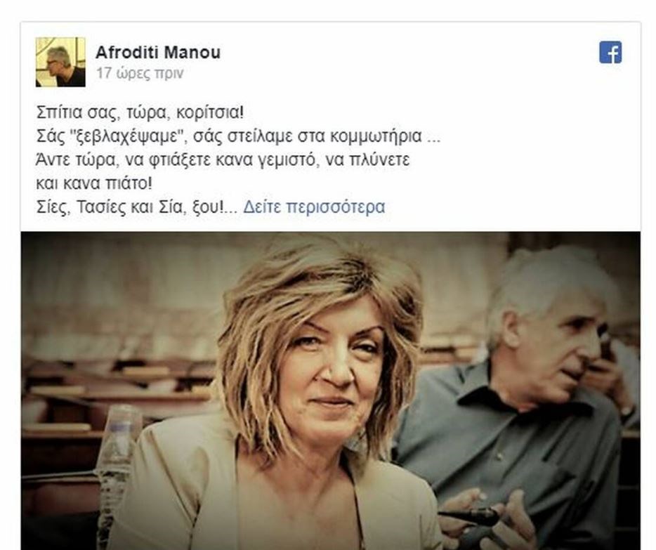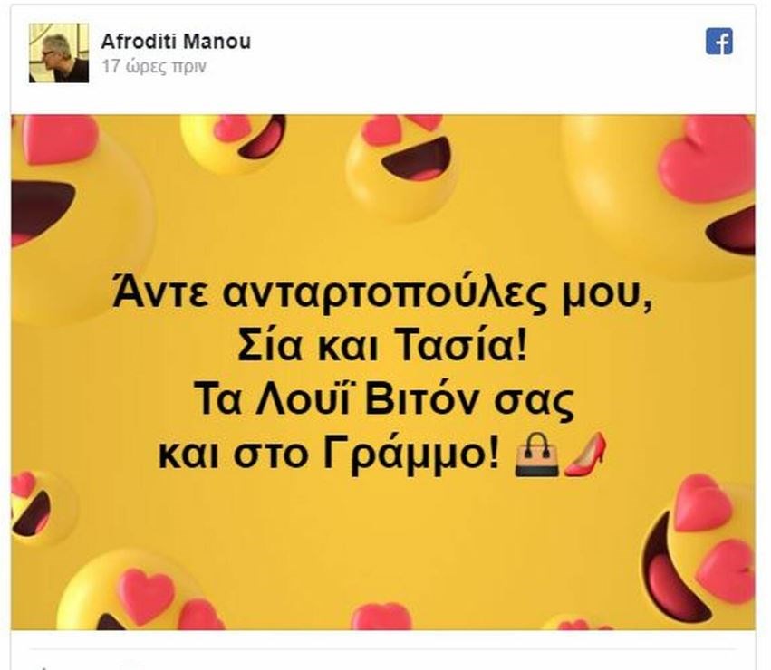Ιδιαίτερα καυστική εναντίον των, Σίας Αναγνωστοπούλου και Τασίας Χριστοδουλοπούλου, η τραγουδίστρια Αφροδίτη Μάνου, με αναρτήσεις της στο facebook.Στην πρώτη ανάρτησή της η Αφροδίτη Μάνου αναφέρει: «Άντε ανταρτοπούλες μου, Σία και Τασία! Τα Λουΐ Βιτόν σας και στο Γράμμο!».Και σε δεύτερη ανάρτησή της η Αφροδίτη Μάνου γράφει:«Σπίτια σας, τώρα, κορίτσια! Σας «ξεβλαχέψαμε», σας στείλαμε στα κομμωτήρια… Σίες, Τασίες και Σία, ξου! Εθνομηδενισμός, λαθρομετανάστες που λιάζονται και Ιστορία τσάτρα – πάτρα απ’ την Πάτρα στυλ Ρεπούση, αρκετά! Σπίτι, γρήγορα!».Δείτε εδώ τις αναρτήσεις της Αφροδίτης Μάνου: