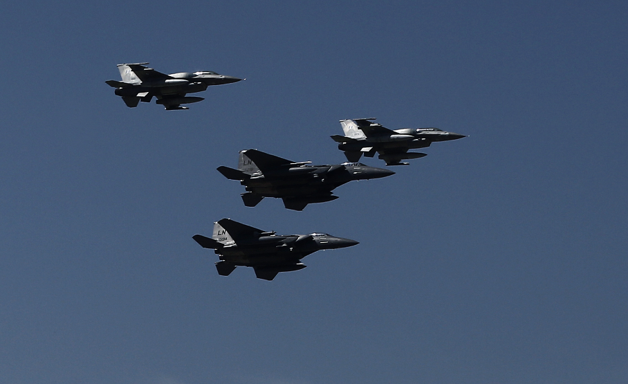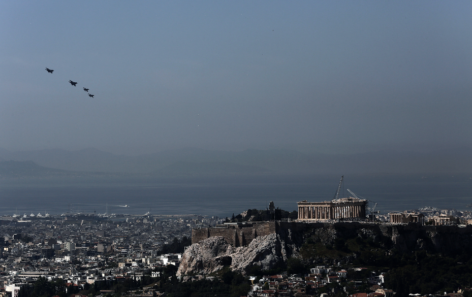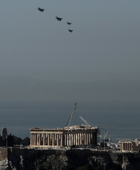 Δύο ελληνικά F-16 και δύο αμερικανικά F-15 μαχητικά αεροπλάνα πραγματοποίησαν υπερπτήση σε σχηματισμό πάνω από την Ακρόπολη.