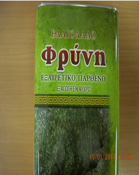 Β)  Προϊόν με την εμπορική επωνυμία «ΦΡΥΝΗ», σε συσκευασία των 5 L και ημερομηνία λήξης 31-12-2015, το οποίο επιπλέον φέρει τις ενδείξεις «ΚΟΝΤΟΓΙΩΡΓΗΣ ΑΝΤΩΝΗΣ – ΣΟΥΓΙΑ ΧΑΝΙΩΝ».