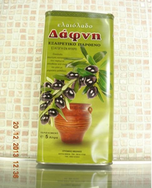 Δ)  Προϊόν με την εμπορική επωνυμία «ΔΑΦΝΗ», σε συσκευασία των 5 L και ημερομηνία λήξης 31-12-2015, το οποίο επιπλέον φέρει τις ενδείξεις «ΓΡΥΠΑΚΗΣ ΝΙΚΟΛΑΟΣ – ΣΟΥΓΙΑ ΧΑΝΙΩΝ».