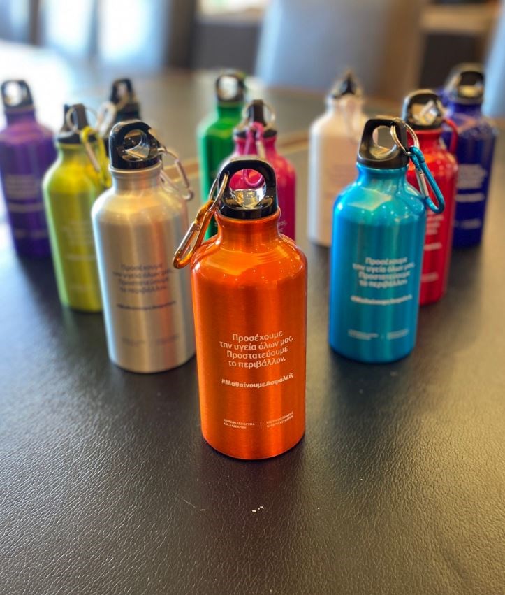 Τα παγούρια που θα μοιραστούν στα παιδιά είναι διαφόρων χρωμάτων και γράφουν πάνω: “Προσέχουμε την υγεία όλων μας. Προστατεύουμε το περιβάλλον. #Μαθαίνουμε Ασφαλείς” .