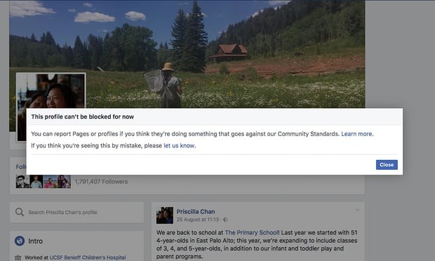 Πολλές φορές οι περισσότεροι από εμάς έχουν θελήσει να μπλοκάρουν κάποιον ενοχλητικό χρήστη στο facebook ή κάποιον που δεν θέλουμε να βλέπει τα προσωπικά μας δεδομένα.Υπάρχουν ωστόσο δύο προφίλ στα οποία δεν μπορούμε να κάνουμε μπλοκ. Αυτά τα προφίλ είναι του ιδρυτή του Facebook, Mark Zuckerberg, αλλά και της συζύγου του, Priscilla Chan.