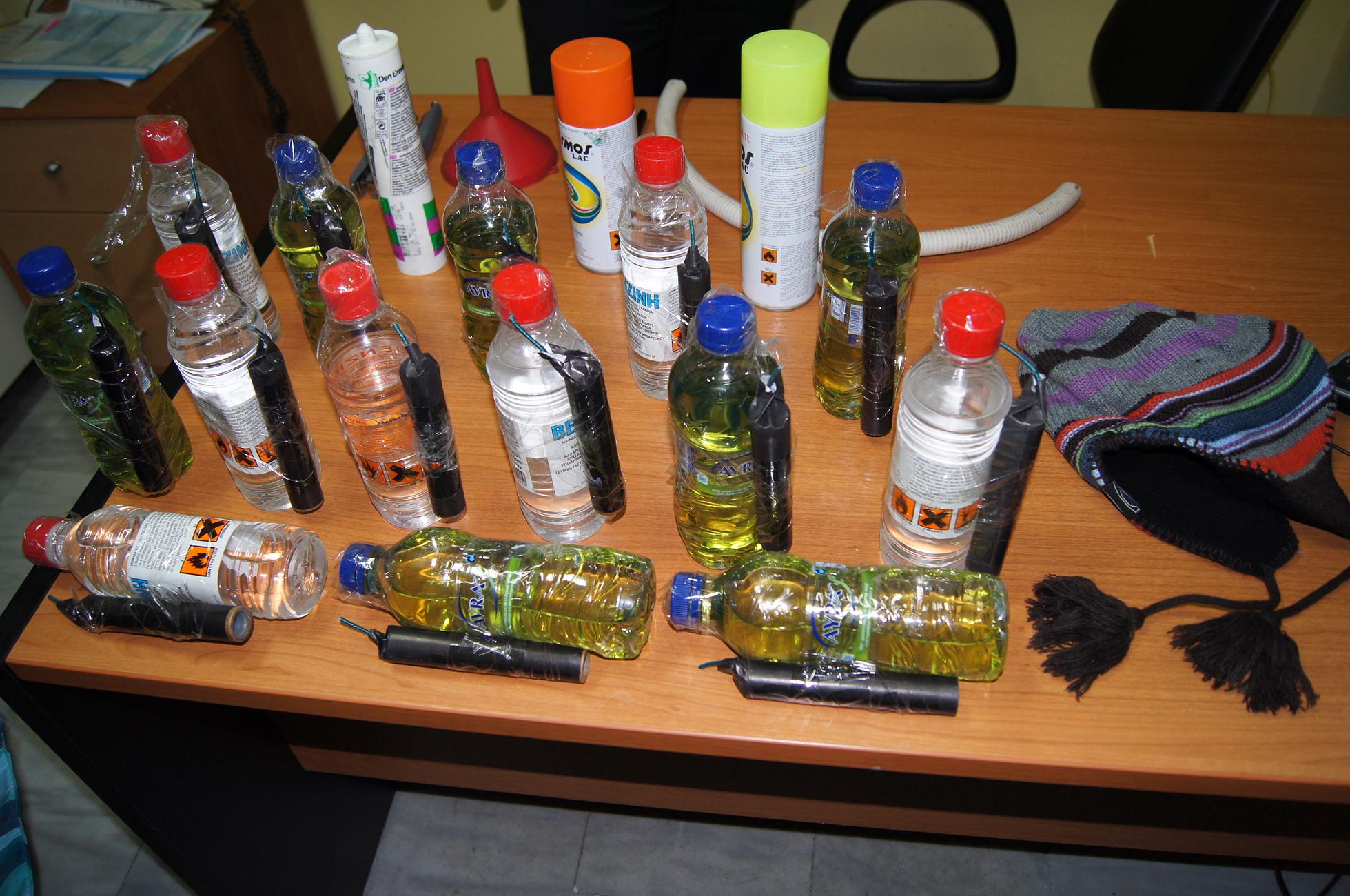 δεκατέσσερις (14) αυτοσχέδιοι εκρηκτικοί εμπρηστικοί μηχανισμοί, αποτελούμενοι από πλαστικά μπουκάλια νερού με εύφλεκτο υγρό και πάνω σε αυτά ήταν τυλιγμένες με μονωτική ταινία μεγάλες κροτίδες.ένα (1) σωληνάριο σιλικόνης.δύο (2) μεταλλικά συρραπτικά.ένα (1) πλαστικό χωνί.ένα (1) κομμάτι λάστιχου μήκους (50) εκατοστών.ένας (1) μάλλινος σκούφος.δύο (2) σπρέι χρώματος.