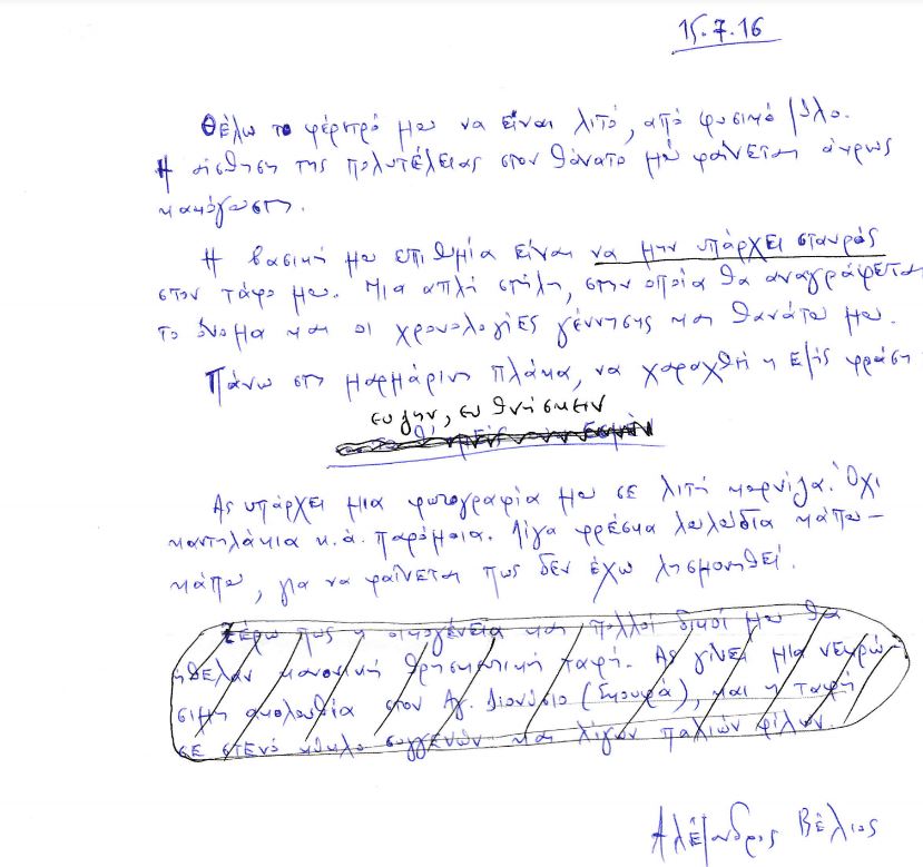 “Θέλω το φέρετρό μου να είναι λιτό, από φυσικό ξύλο. Η αίσθηση της πολυτέλειας στον θάνατο μου φαίνεται άκρως κακόγουστη. Η βασική μου επιθυμία είναι να μην υπάρχει σταυρός στον τάφο μου. Μια απλή στήλη, στην οποία θα αναγράφεται το όνομα και οι χρονολογίες γέννησης και θανάτου μου. Πάνω στη μαρμάρινη πλάκα, να χαραχθεί η εξής φράση: Ευ ζην, ευ θνήσκειν .Αν υπάρχει μια φωτογραφία μου σε λιτή κορνίζα. Όχι καντηλάκια και άλλα παρόμοια. Λίγα φρέσκα λουλούδια κάπου – κάπου, για να φαίνεται πως δεν έχω λησμονηθεί” αναφέρει ο Αλέξανδρος Βέλιος στις επιστολές του.