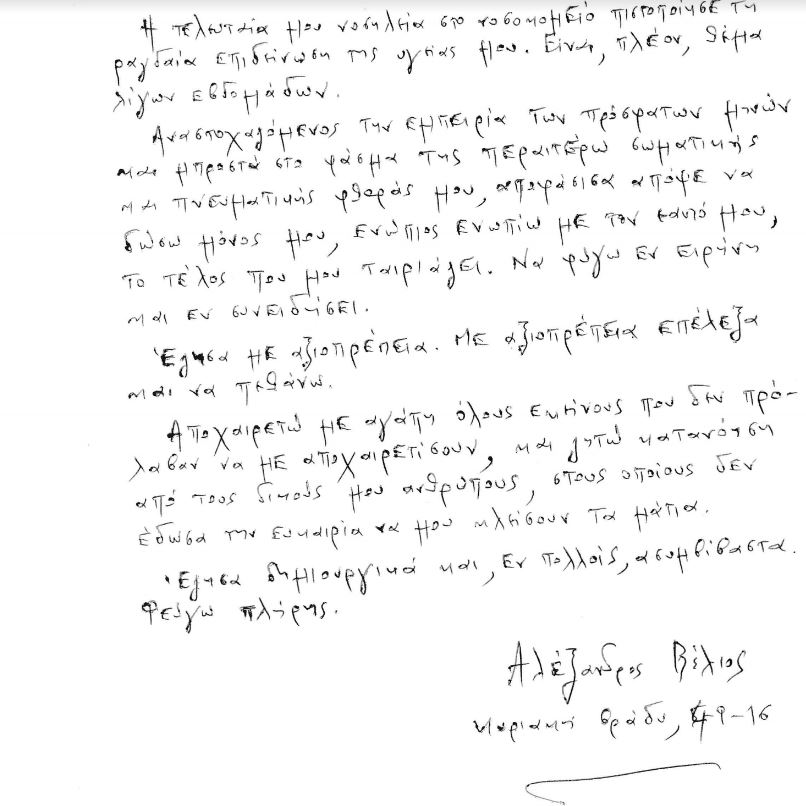 «Η τελευταία μου νοσηλεία μου στο νοσοκομείο επιβεβαίωσε τη ραγδαία επιδείνωση της υγείας μου. Είναι πλέον θέμα λίγων εβδομάδων. Αναστοχαζόμενος την εμπειρία και μπροστά στο φάσμα της σωματικής και ψυχικής μου φθοράς αποφάσισα απόψε να δώσω μόνος μου, ενώπιος ενωπίω με τον εαυτό μου, το τέλος που μου ταιριάζει. Να φύγω εν ειρήνη και εν συνειδήση. Έζησα με αξιοπρέπεια. Με αξιοπρέπεια επέλεξα να πεθάνω», λέει, μεταξύ άλλων, ο δημοσιογράφος και, ζητώντας συγγνώμη από τους οικείους του, καταλήγει: «έζησα δημιουργικά και, εν πολλοίς, ασυμβίβαστα. Φεύγω πλήρης».