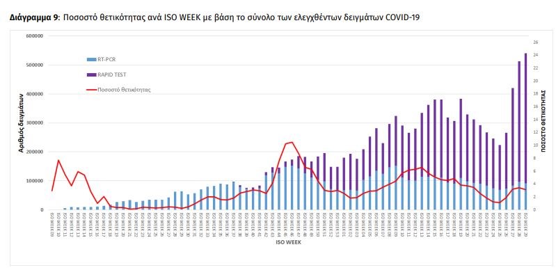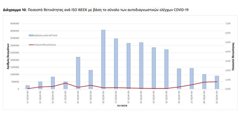 Τα τελευταία στοιχεία αναφορικά με τα ποσοστά θετικότητας που καταγράφονται ανά περιοχή, έδωσε στη δημοσιότητα ο ΕΟΔΥ. Πρόκειται για συγκεντρωτικά στοιχεία της εβδομάδας 19 Ιουλίου 2021 – 25 Ιουλίου 2021 (2021-W29). Το συγκεκριμένο χρονικό διάστημα, το ποσοστό θετικότητας ήταν 3.26% σε σύνολο 540.283 εργαστηριακών ελέγχων (RT-PCR/Rapid-Ag) και 0.79% σε σύνολο 894.838 αυτοδιαγνωστικών ελέγχων. Στο σύνολο των ελέγχων, το ποσοστό θετικότητας ήταν 1.46%.
